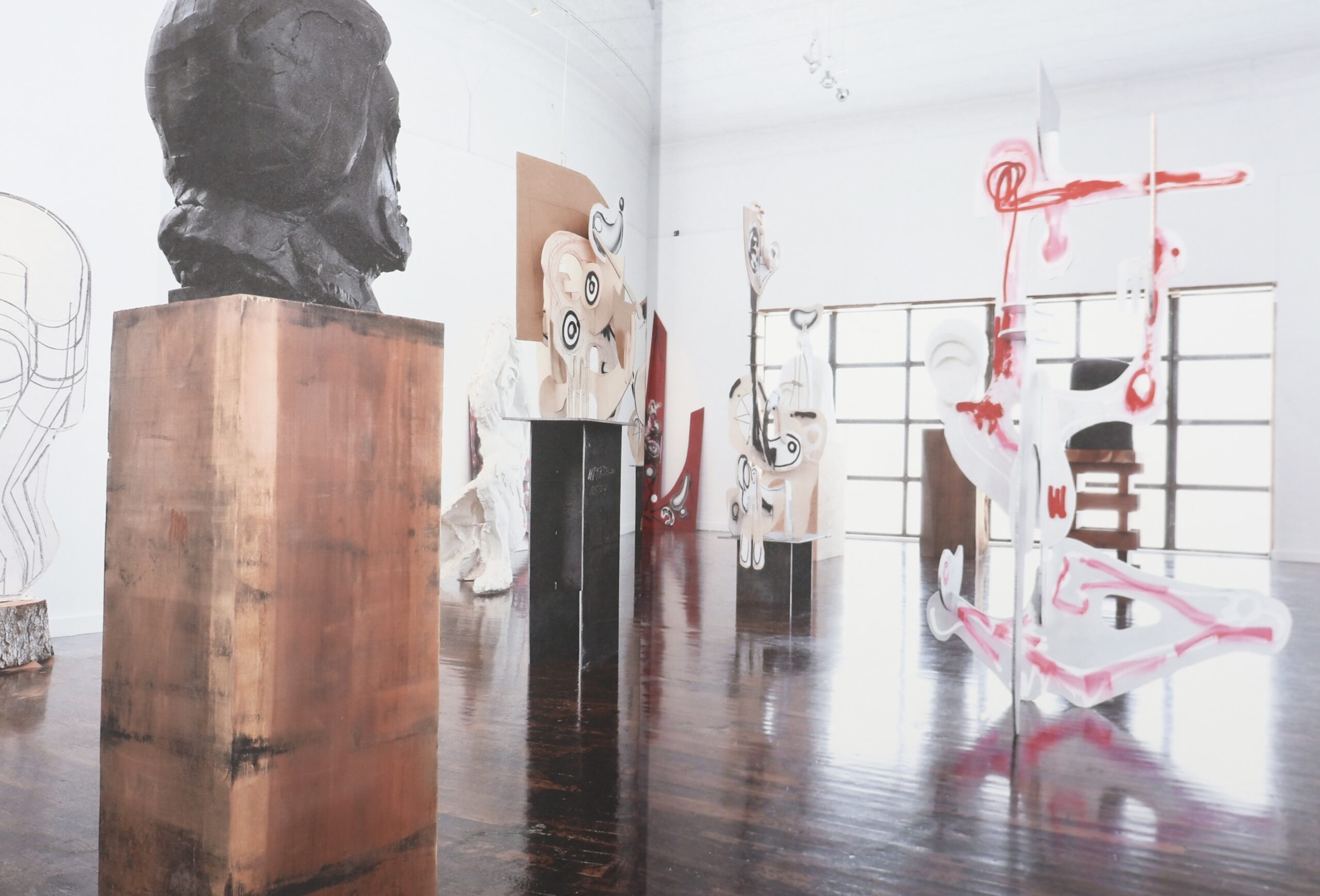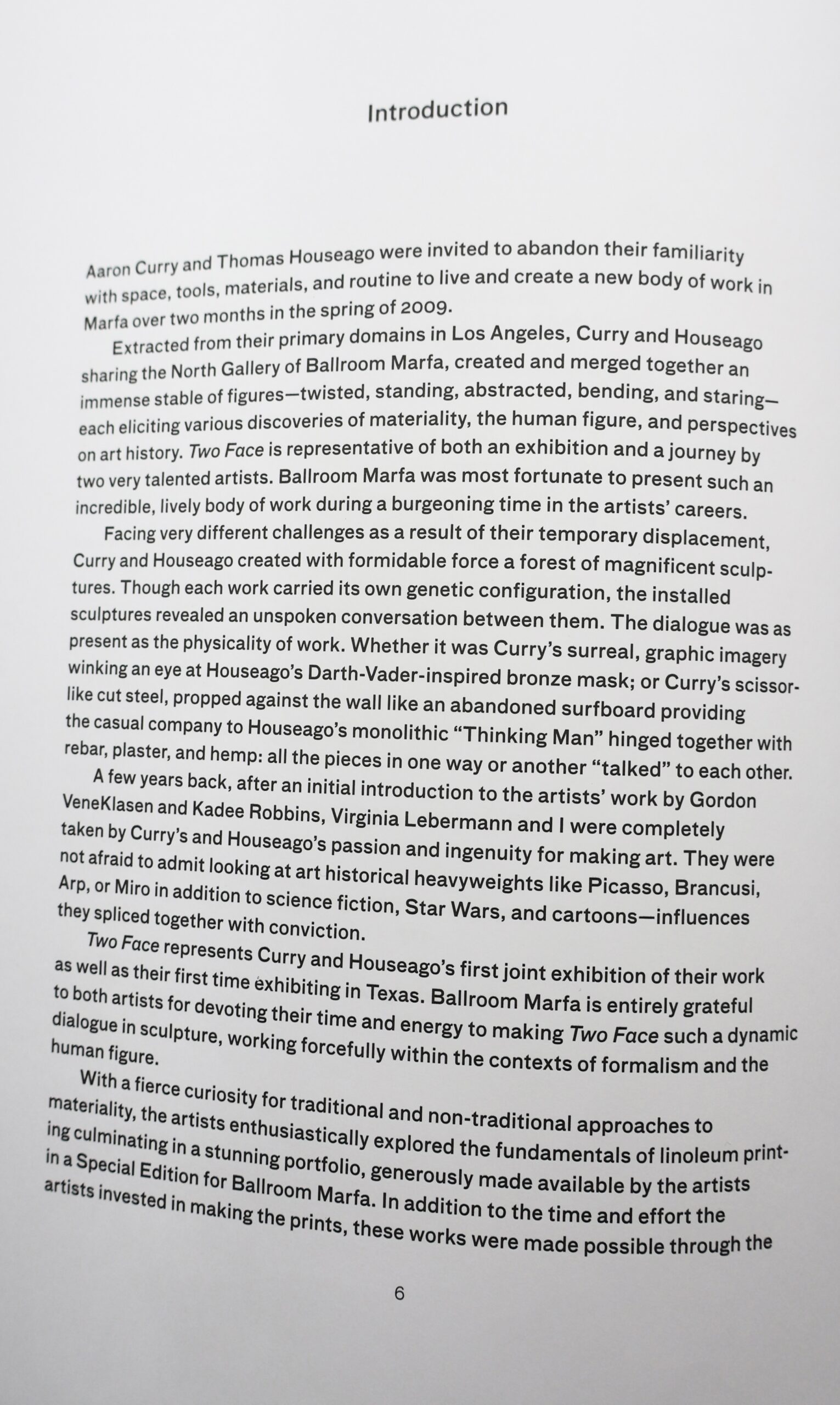 Two Face is an exhibition by Ballroom Marfa resident artists Aaron Curry (b. 1972) and Thomas Houseago (b. 1972). The Los Angeles-based artists are sculptors whose artistic practice takes a kind of “Janus-faced” view of form and creative process, while referencing the past and seeking new directions for the future.