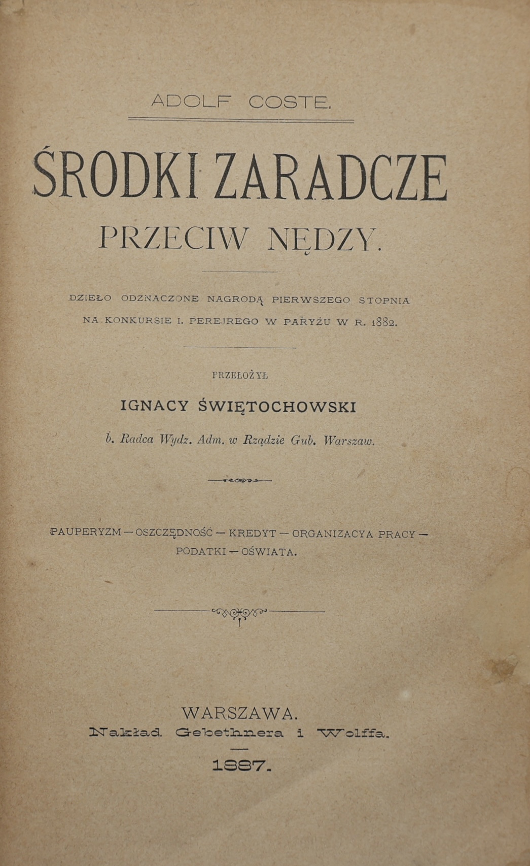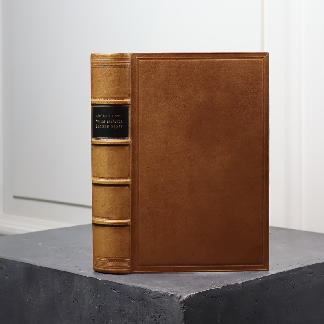 This is the first Polish edition of the classic work of French economist and sociologist Adolphe Coste (1842-1901) – “Les moyens de combattre la misère” (“Remedies against Misery”), which was published in Paris in 1883. The Polish translation, by Ignacy Świętochowski (brother of the famous publicist Aleksander Świętochowski), was published in 1887 by Gebethner and Wolff in Warsaw.