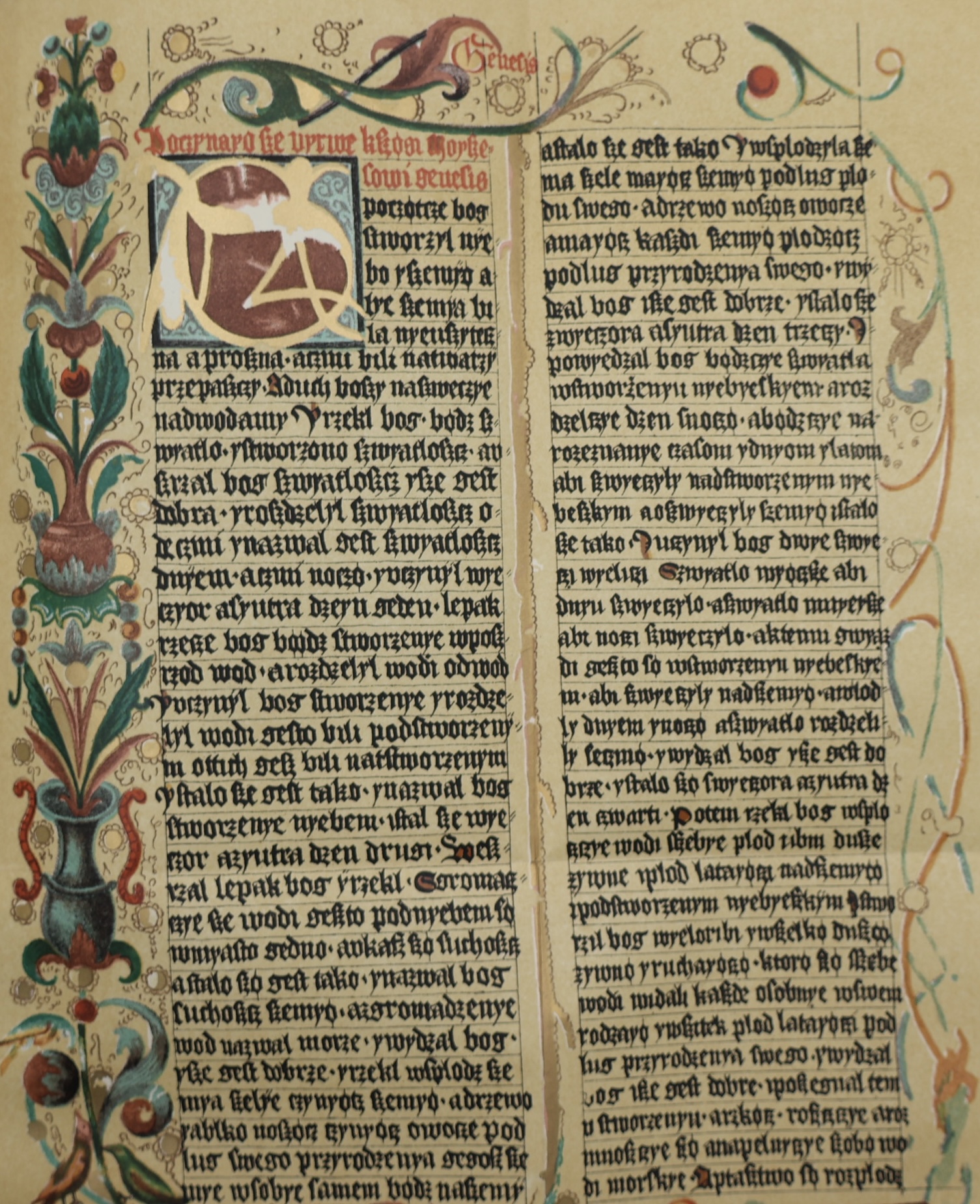 The book has 190 pages, is enriched with 70 engravings in the text and two plates (including one fold-out, chromolithographic) – among them a likeness of a page of the Queen Sophia Bible. A clean copy, bound in an exclusive, hand-made binding in natural leather by the Polish Antiquarian Bookbindery.