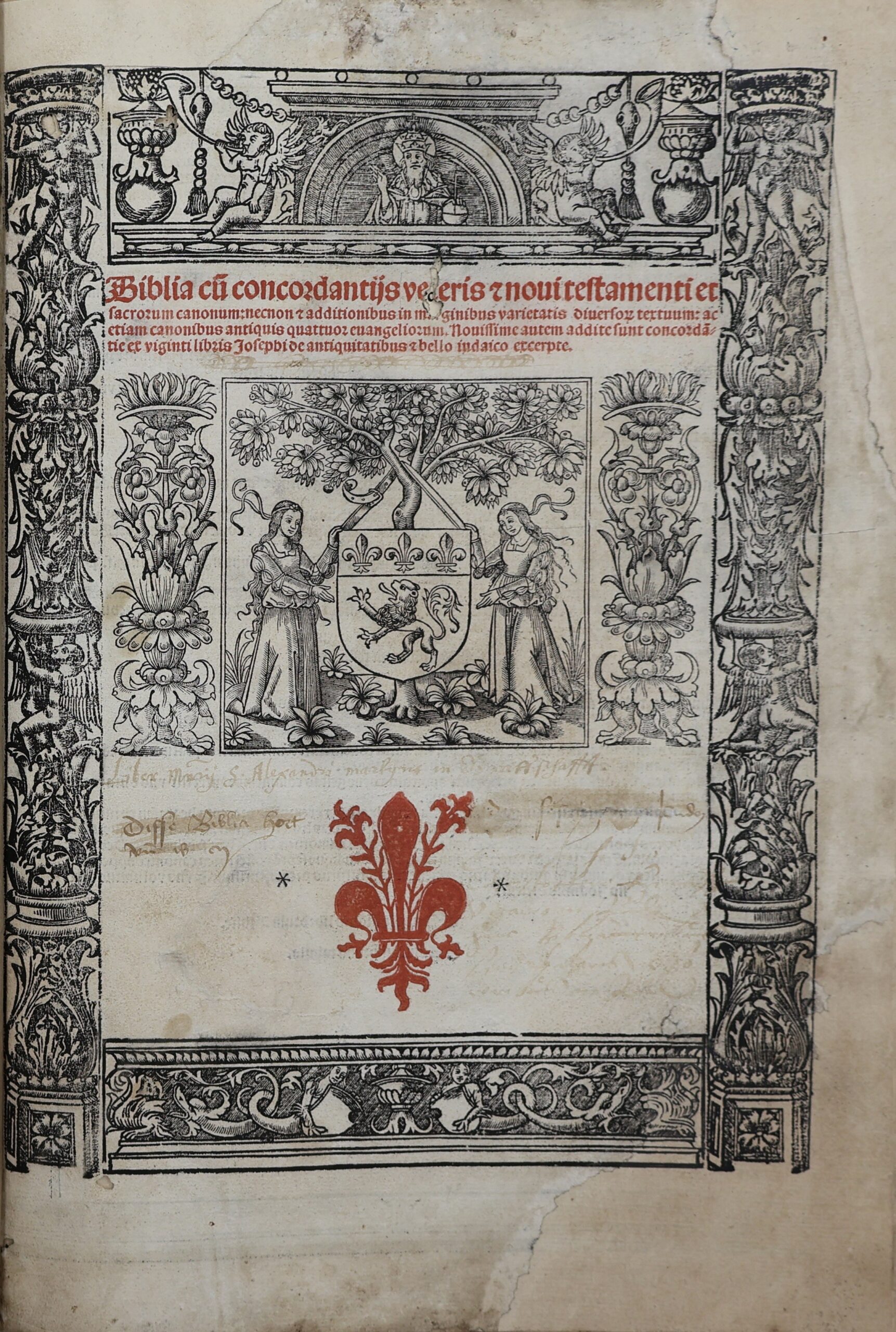 Title page damaged with losses repaired with new paper on which graphic elements were added. Traces of moisture on the upper margin through the entire block. Other than that, the copy is very well preserved.