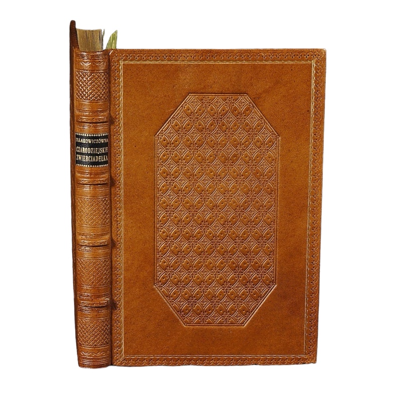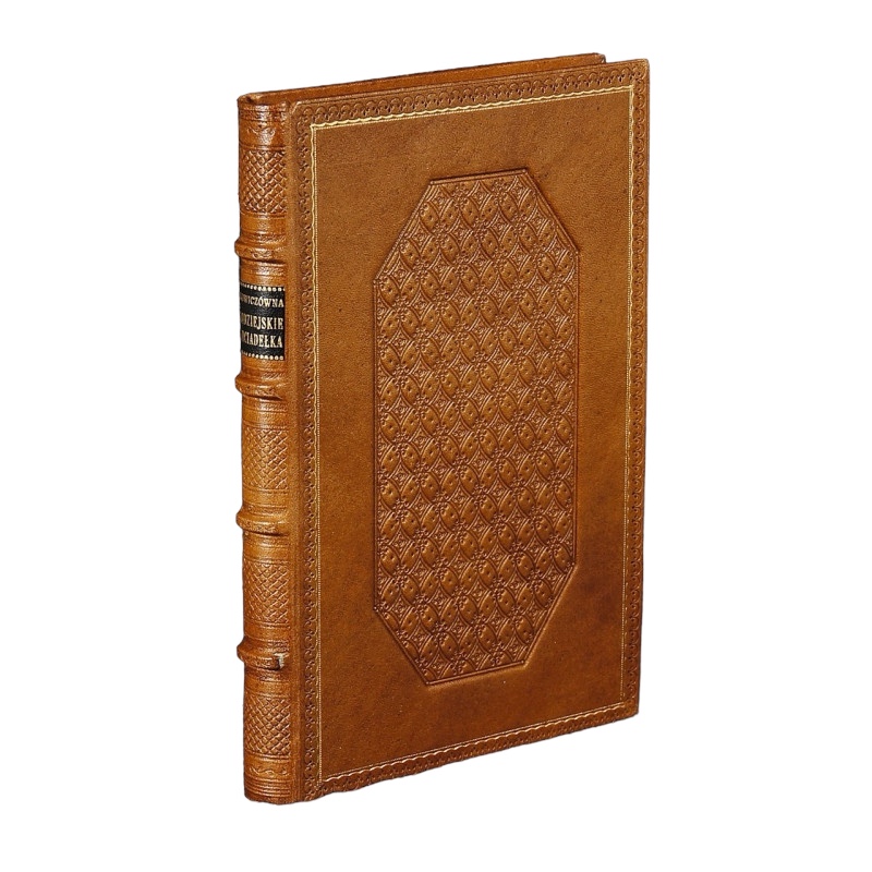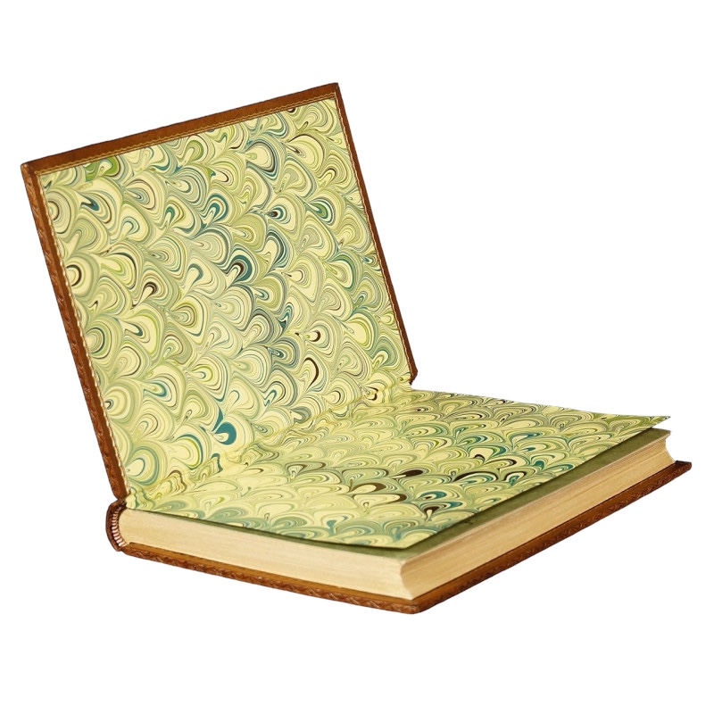 Full light brown leather. Decorative embossing on spine, covers and edges of binding. Gilding on the corners. Gold titling on the leather signboard. Hand-marbled bindings. The edges of the pages gilded.