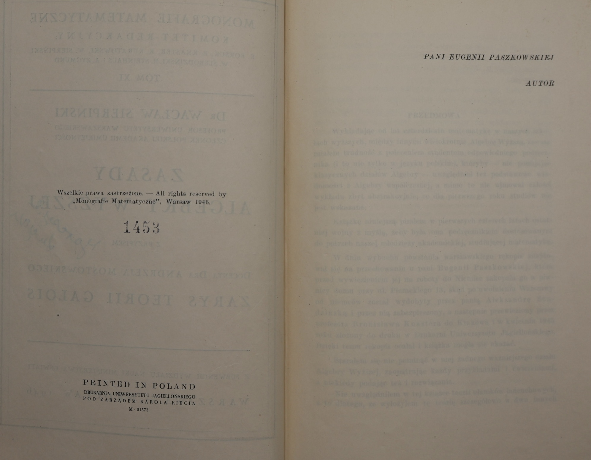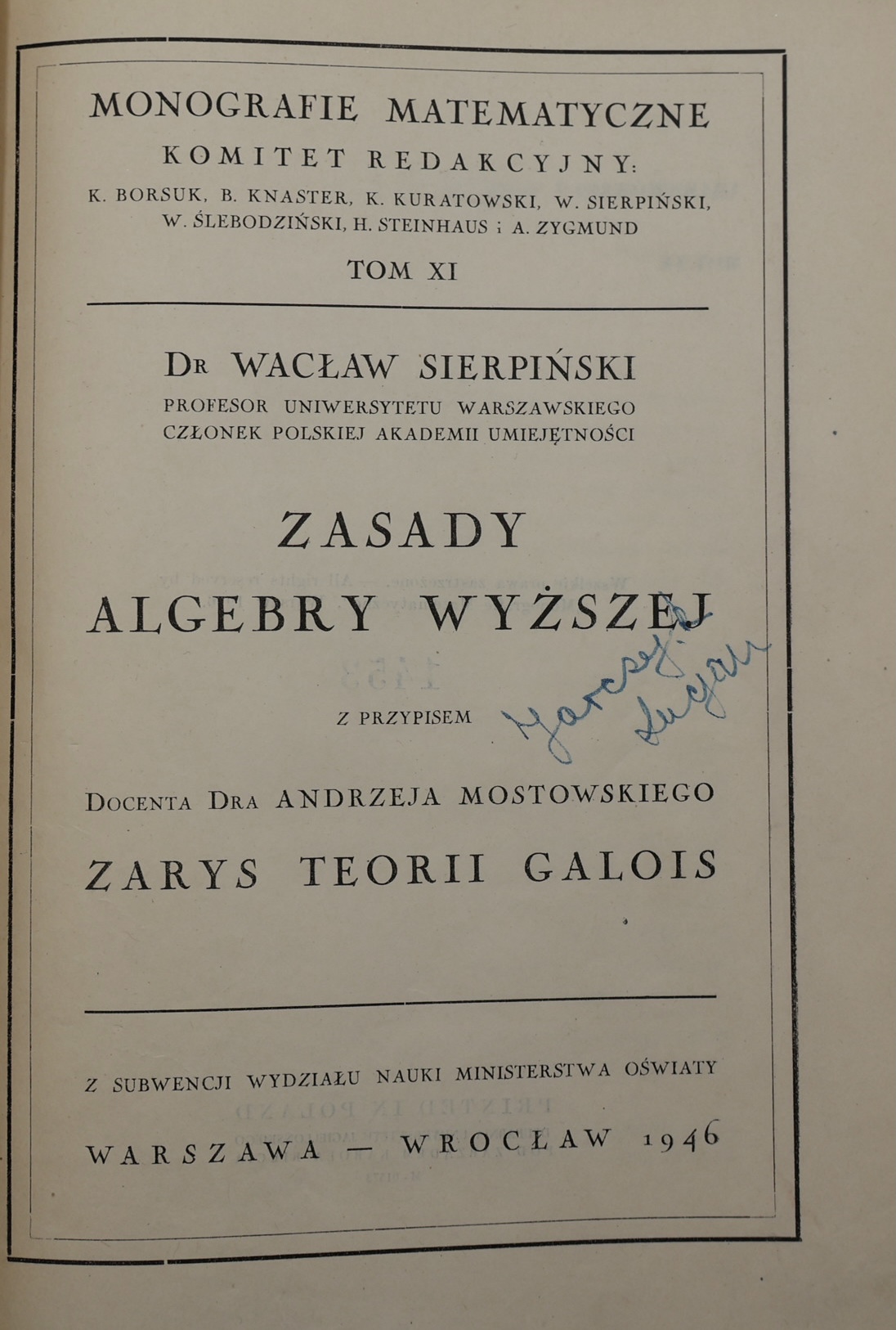 ![DR WACŁAW SIERPIŃSKI: PRINCIPLES OF HIGHER ALGEBRA WITH A FOOTNOTE BY DOCENT DR ANDRZEJ MOSTOWSKI OUTLINE OF GALOIS THEORY [1946]. - Image 6](https://antykwariat-polski.pl/wp-content/uploads/2026/04/IMG_0345.jpeg)
