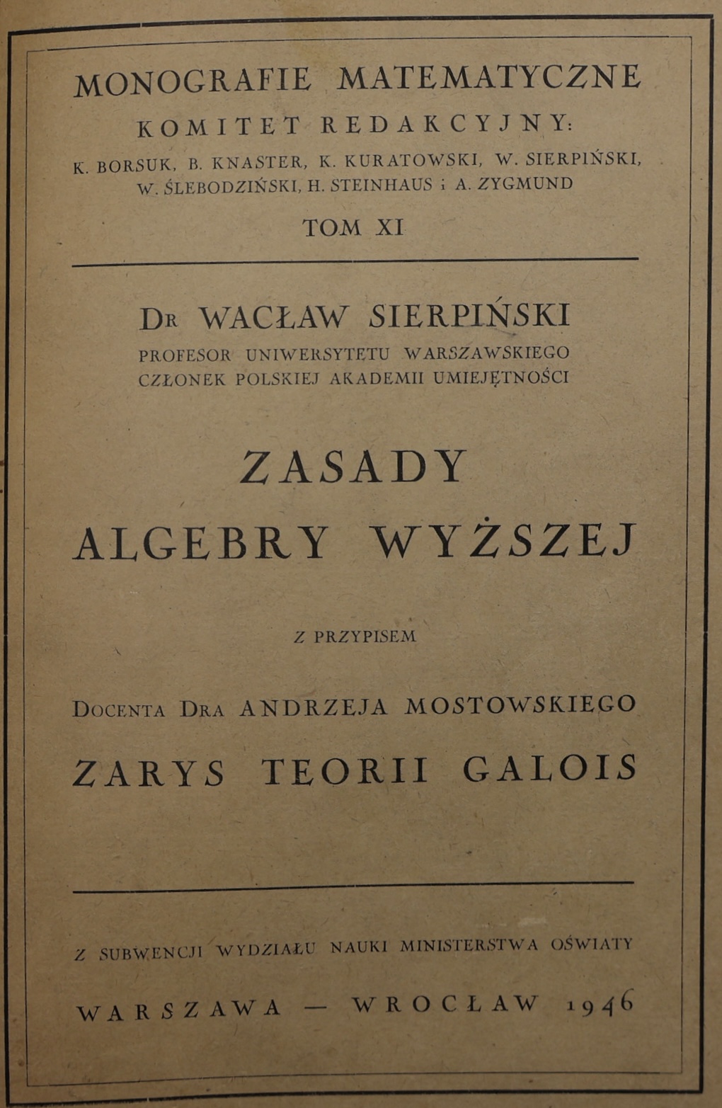 DR WACŁAW SIERPIŃSKI: PRINCIPLES OF HIGHER ALGEBRA WITH A FOOTNOTE BY DOCENT DR ANDRZEJ MOSTOWSKI OUTLINE OF GALOIS THEORY [1946].