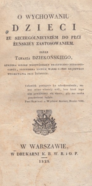 “O wychowaniu dzieci ze szczególnieyszém do płci kobieńskiéy zastosowaniem” by Tomasz Dziekoński is a fundamental pedagogical work, published in 1828 in Warsaw. This book is a comprehensive analysis and proposals for the upbringing of children, with particular attention to the needs and specifics of the upbringing of girls.