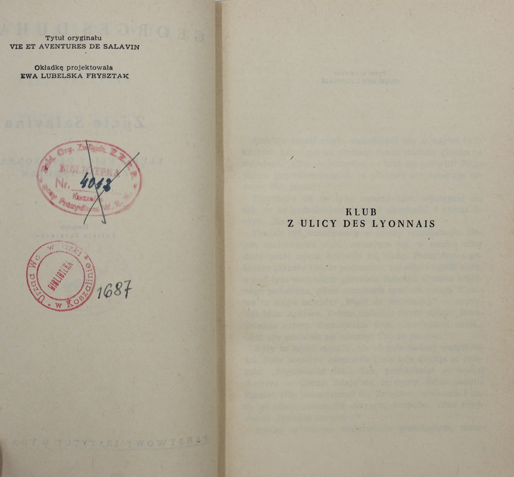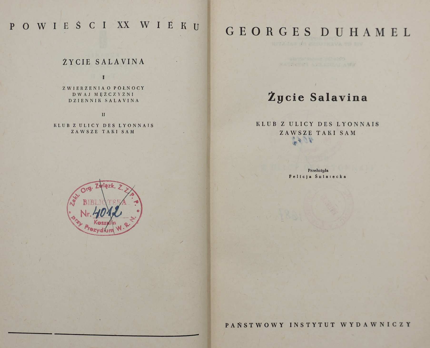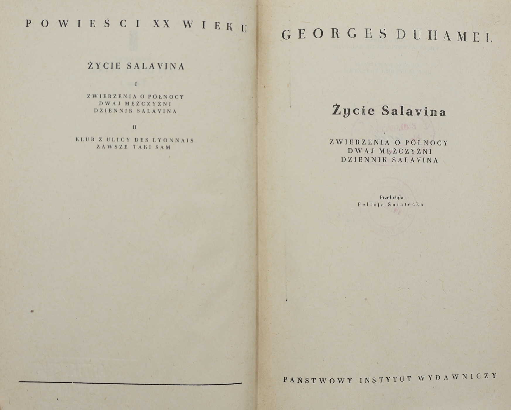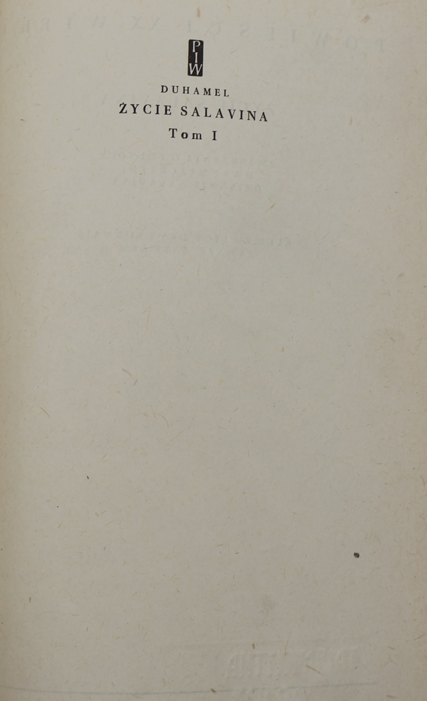 We present the first Polish edition of the novel cycle “Vie et aventures de Salavin” (“Life and adventures of Salavin”) by the outstanding French writer, Goncourt Prize winner (1918), member of the French Academy (1935) – Georges Duhamel (1884-1966). It was published in 1971 in Warsaw by the State Publishing Institute (PIW) in the prestigious “Novels of the 20th Century” series. It was translated from the French by Felicja Sniałecka, a respected translator of French literature.