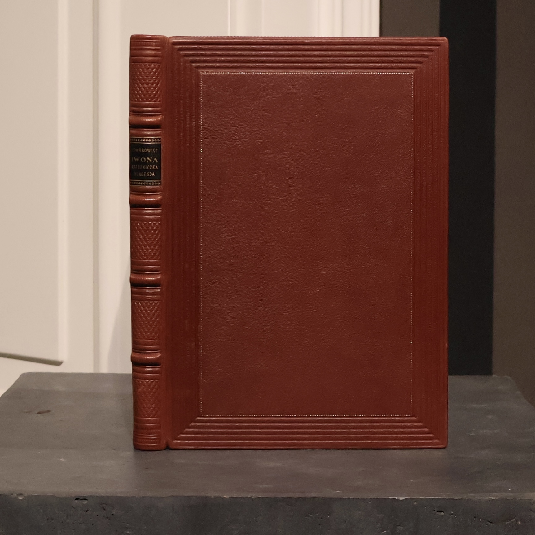 It is interesting to note that Yvonne, Princess of Burgundy was written under the influence of Gombrowicz’s experience of emigration and alienation in a new environment. The work can be interpreted as a metaphor for the difficulties of adaptation and the search for one’s own identity. The present copy, bound in fine leather by the Polish Antiquarian Bindery, takes on an additional dimension. The elegant, unique binding emphasizes the uniqueness of this edition and adds to its prestige. Owning such a book is not only an investment in a rare and valuable collector’s item , but also an expression of refined taste and interest in literature. Image-wise, owning this edition of Iwona raises the prestige of the owner, signaling his love for the classics of Polish literature and attention to detail.