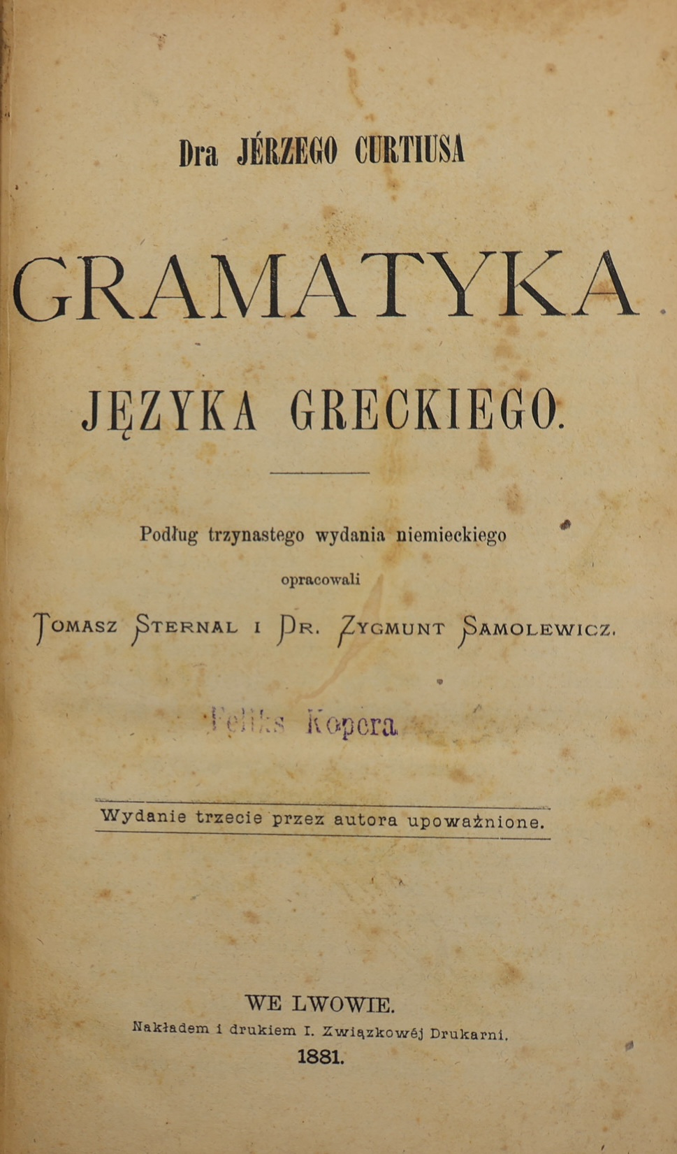 The publication was published in 1881 by the Lviv-based I. Union Printing House. Curtius’ Grammar was one of the most important and widely used Greek textbooks in Europe in the 19th century, combining a solid historical grammar lecture with a practical approach to teaching the classical language. The Polish edition, compiled by Sternal and Samolewicz, included explanations and additions adapted to the needs of the Polish student.