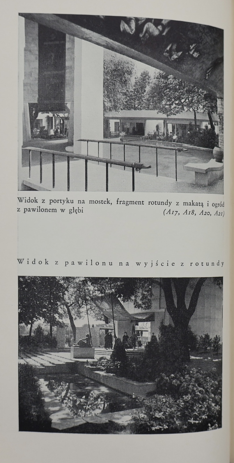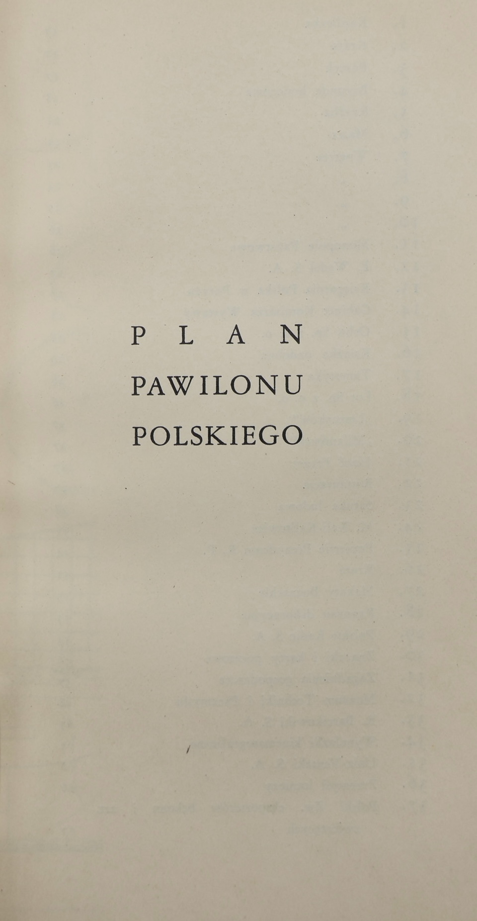 The Polish pavilion, designed by Jozef Szanajca, was considered one of the most beautiful at the exhibition – as evidenced by the fact that it received the Grand Prix in the architecture category. The catalog documents all of the Polish exhibitions: from painting and sculpture (including paintings by Zofia Stryjeńska, Wladyslaw Skoczylas, Stanislaw Ignacy Witkiewicz), interior design and furniture making, to modern technology, machinery industry, mining, metallurgy, textile industry, as well as the achievements of Polish scientific and technical thought.