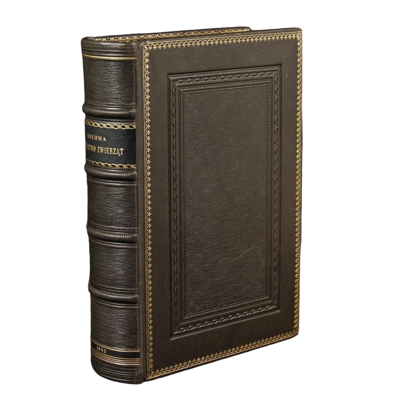 Full dark brown leather. Gilded embossing on covers and corners. Embossing on spine fields and edges. Gilded titlepage on leather escutcheon. The lining and edges of the pages hand-marbled.