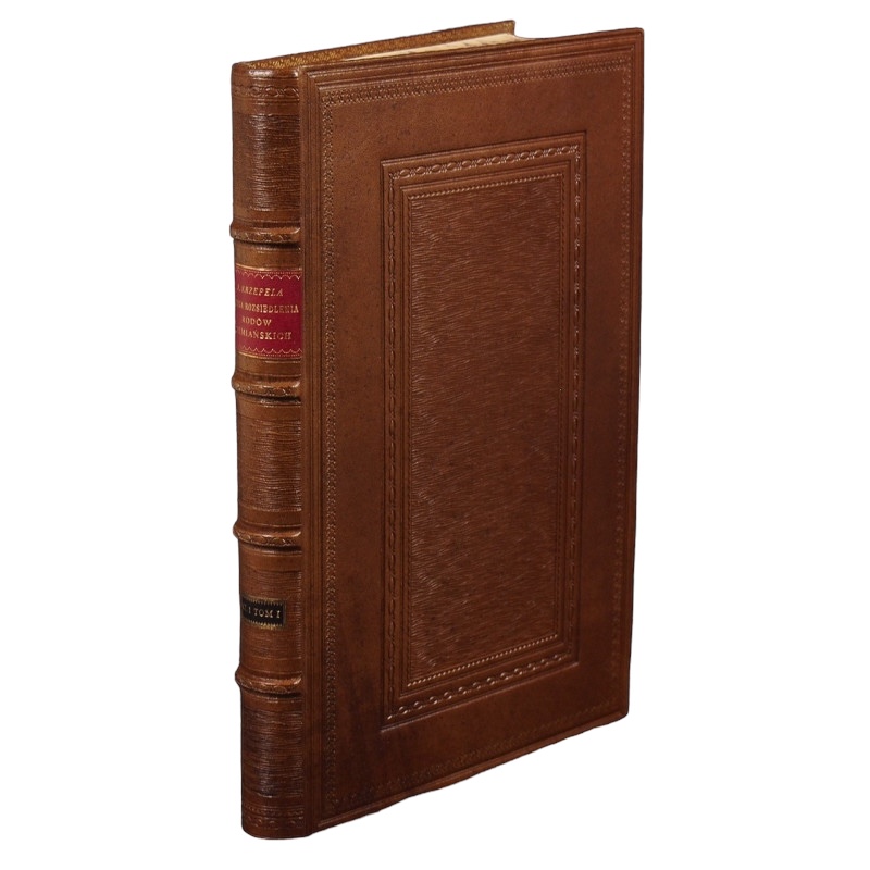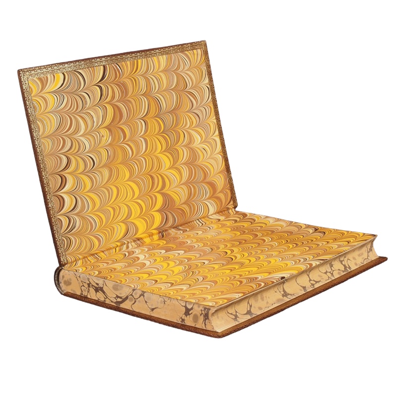 A clean copy in good condition.Full brown leather. Embossing on spine fields, covers and edges. Gilding on the corners. Gilded titlepage on leather escutcheon. The liners and edges of the pages are hand-marbled.