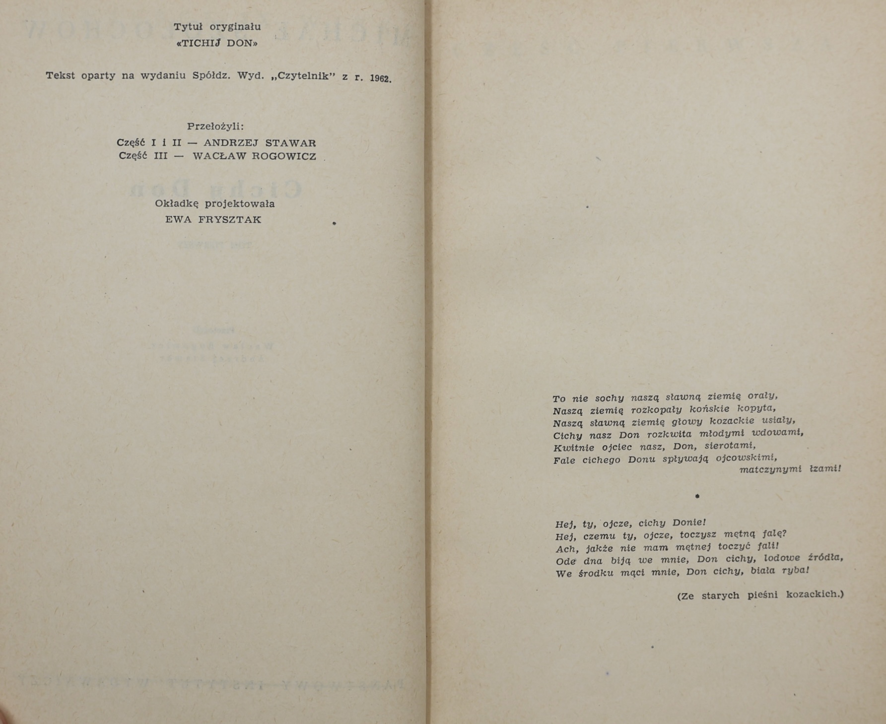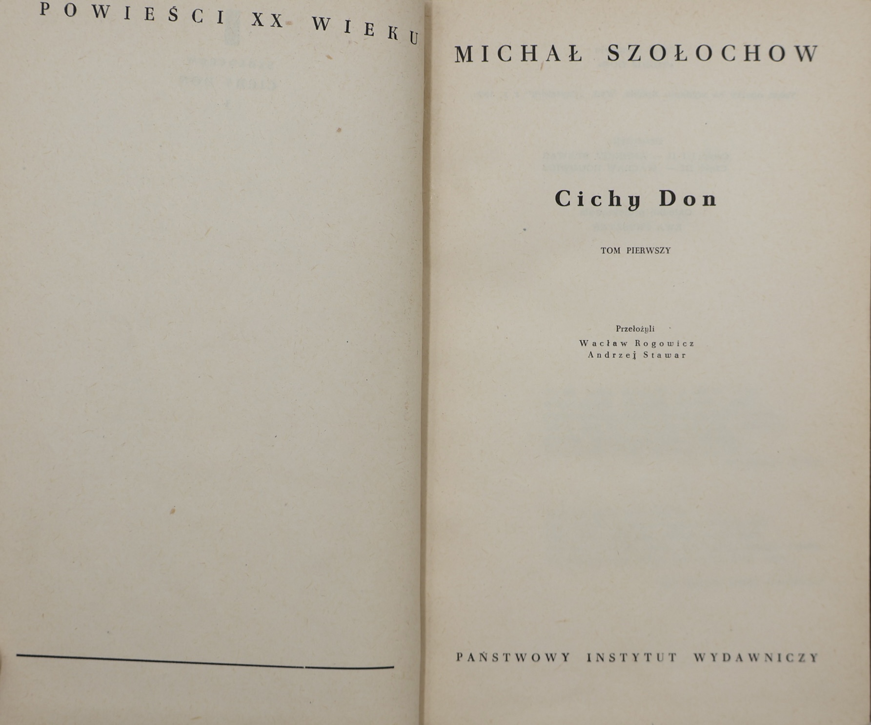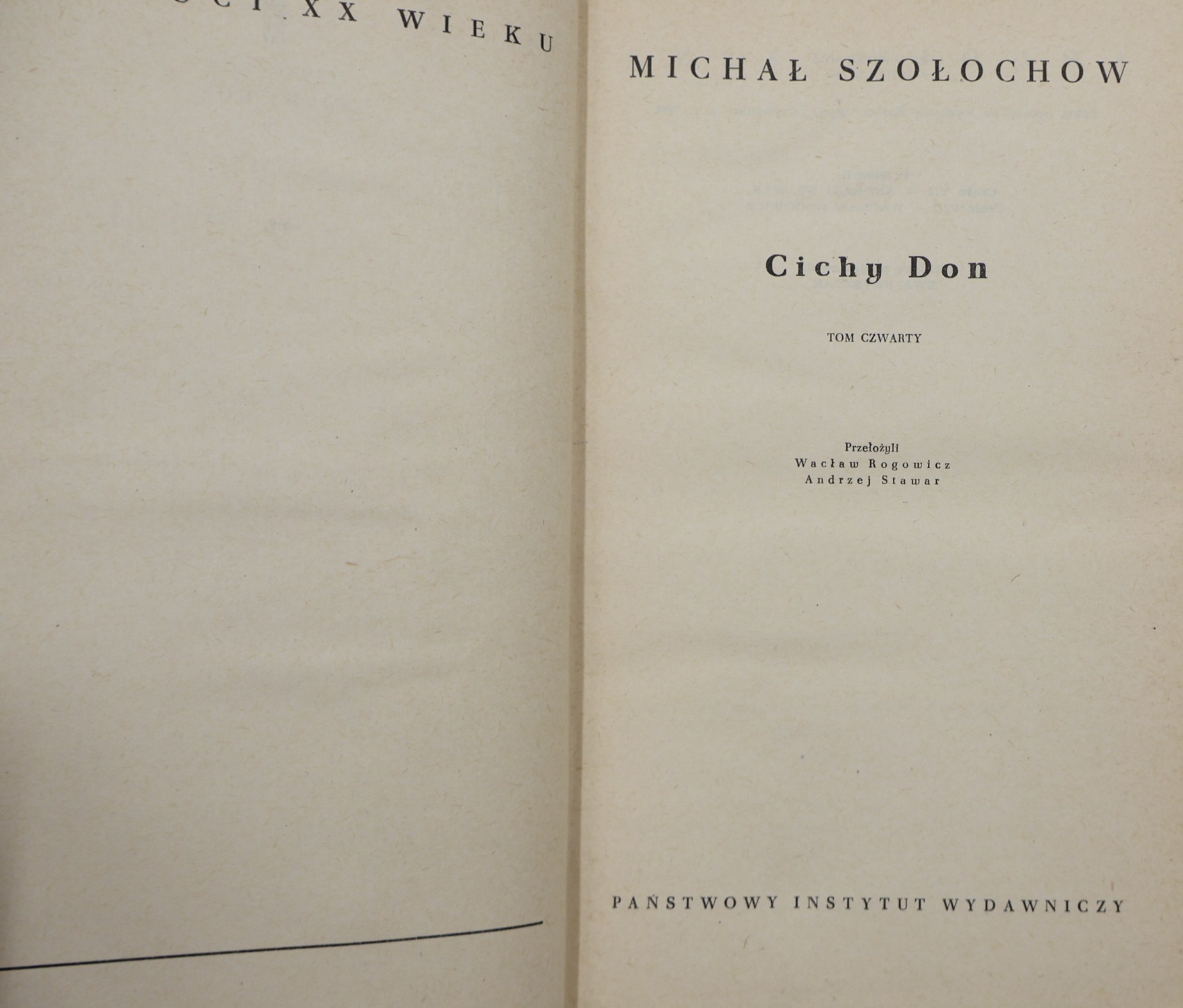 We present an edition of one of the greatest masterpieces of Russian and world literature – “Silent Don” by Mikhail Sholokhov (1905-1984), winner of the Nobel Prize for Literature (1965) . It was published in 1967 in Warsaw by the State Publishing Institute (PIW) in the prestigious “Novels of the 20th Century” series. It was translated by Waclaw Rogowicz (volumes I and II) and Andrzej Stawar (volumes III and IV) – outstanding Polish translators of Russian literature.