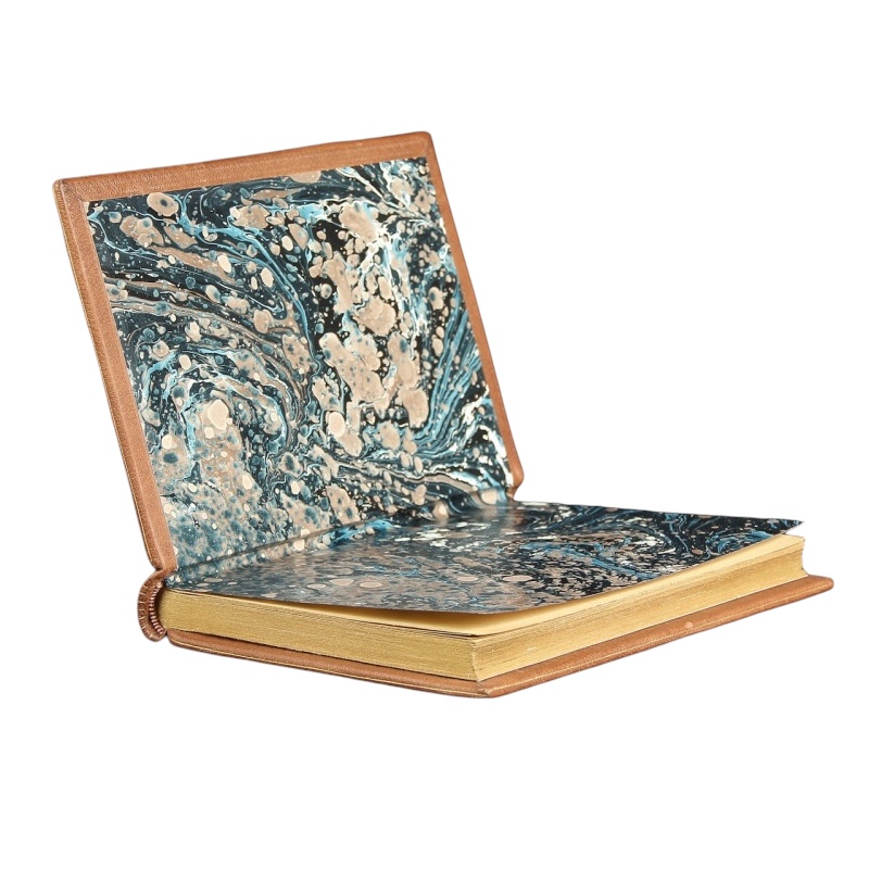 A clean copy in good condition. Discoloration on pages in places. Full brown leather. Embossing on spine and covers. Titling in gold on leather signboard. Stylized embellishments at the corners of the covers. Hand-marbled lining. The edges of the pages gilded.