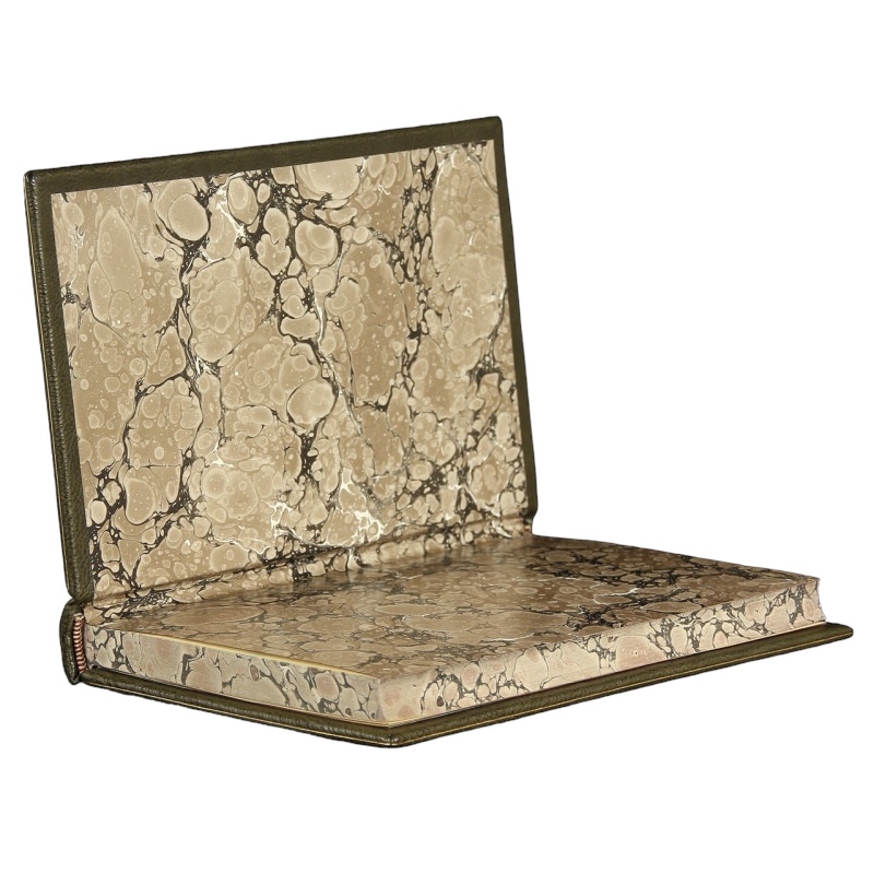 A clean copy in very good condition.Full leather. Embossing on the scrolls and covers. Gilding on the edges. Gold embossed titling on the spine. Coverlets and page edges hand-marbled.
