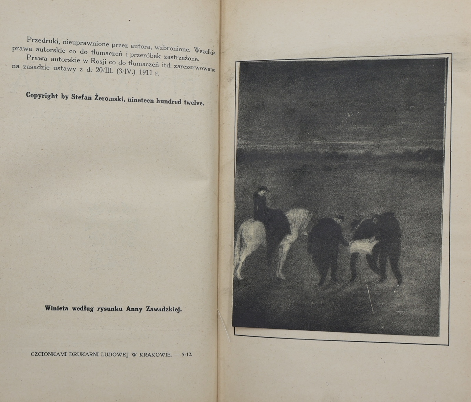 This is the first edition of one of the most important psychological and moral novels by Stefan Zeromski (1864-1925), published in 1912 by the Kraków-based “Książka” publishing company. It was a book that, due to its patriotic and anti-Tsarist message, could only be published outside the reach of Russian censorship, in autonomous Galicia.