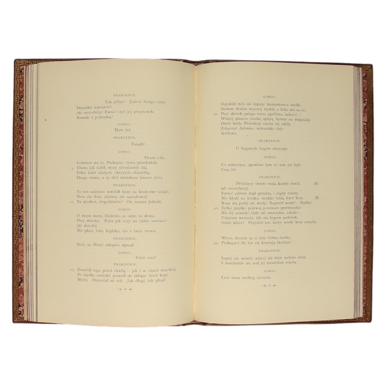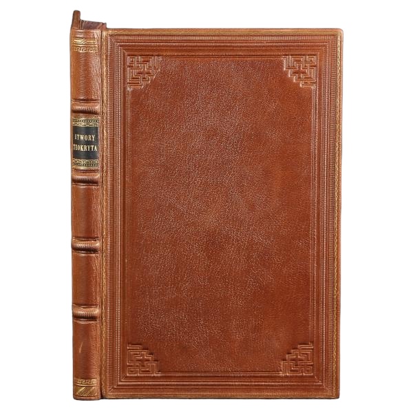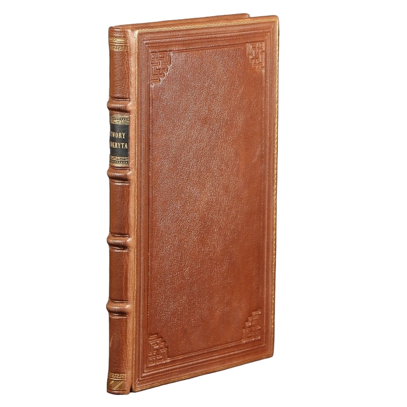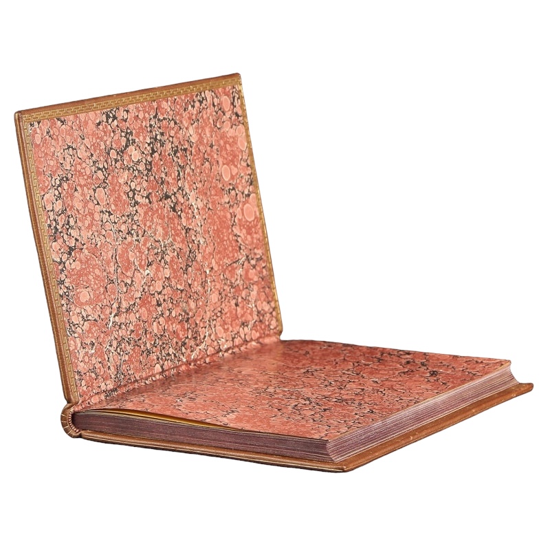 A clean copy in very good condition. Both booklet covers preserved. Minor staining on pre-title page. Full brown leather. Gilt embossing on covers, edges and corners. Gilded titlepage on leather escutcheon. Hand-marbled liners. The edges of the cards are stained.