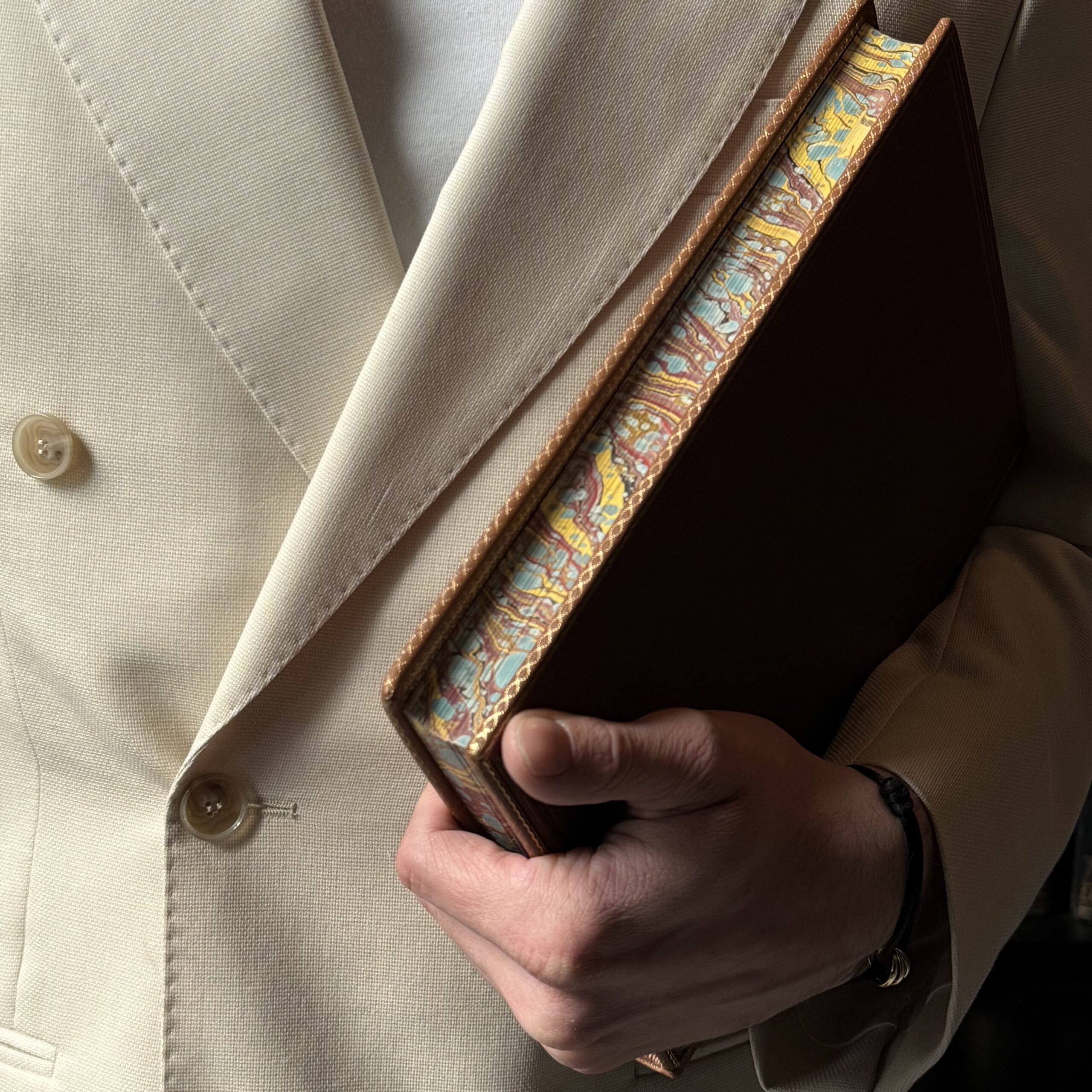 Full brown leather. Binding bound with seven-panel spine. Embossing on the spine fields. Gilding on edges and corners. Titled in gold on a leather signboard. The lining and edges of the pages are hand-marbled.