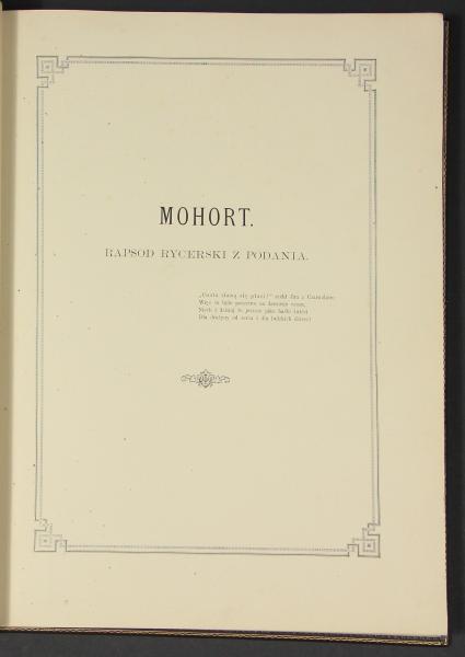 “Mohort: a knight’s rhapsody from a story with 24 il. Wincenty Pol’s “Juliusz Kossak”, published in Lviv around 1883 by the F. H. Richter (H. Altenberg) bookstore, is a fascinating journey into the world of Romantic poetry and painting. This book, which appears very rarely, is not only an edition of the poetic work of Wincenty Pol, but also a true work of graphic art, richly illustrated by the outstanding painter Juliusz Kossak. Kossak’s 24 illustrations, faithfully depicting the atmosphere and mood of the rhapsody, are an extremely valuable addition to the content of the book itself. “Mohort” is a story of brave knights, their valiant deeds and romantic love, and Kossak’s illustrations add a unique dimension to it. The book is an extremely valuable copy for collectors and lovers of Polish literature and painting of the 19th century.