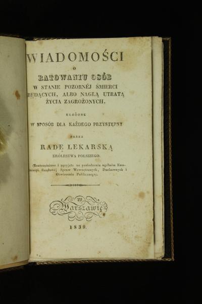 Pierwodruk pierwszego polskiego opracowania postępowania lekarskiego w przypadkach wymagających natychmiastowej interwencji, np. utonięcia, uduszenia, zmarznięcia, rażenie piorunem, apopleksją, sparzenia, otrucia, z osobna obszernie opisanymi truciznami i antidotum itd.