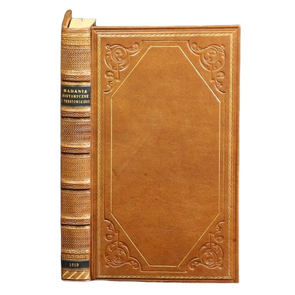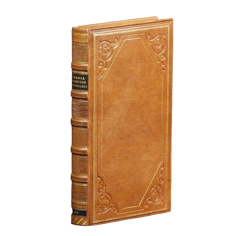 Egzemplarz w dobrym stanie. Pełna brązowa skóra. Dekoracyjne tłoczenia na polach grzbietu oraz okładkach. Złocenia na krawędziach oraz kancikach. Złocona tytulatura na skórzanym szyldziku. Wyklejka ręcznie marmoryzowana. Brzegi kart złocone.