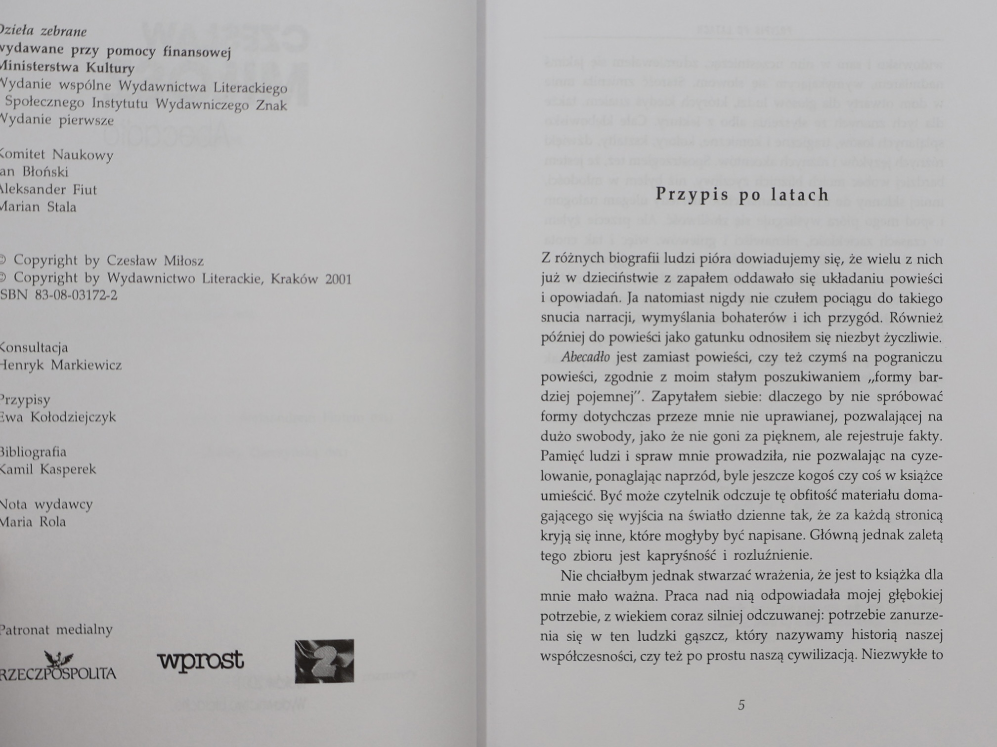 Prezentujemy wydanie „Abecadła” Czesława Miłosza (1911–2004) – poety, prozaika, eseisty, laureata literackiej Nagrody Nobla (1980), jednego z najwybitniejszych i najbardziej wpływowych intelektualistów polskich XX wieku. Publikacja ukazała się w 2001 roku w Krakowie nakładem Wydawnictwa Literackiego jako część prestiżowej serii „Dzieła Zebrane Czesława Miłosza”.
