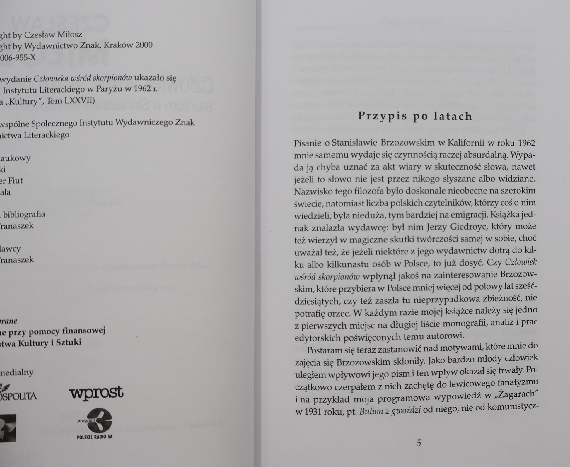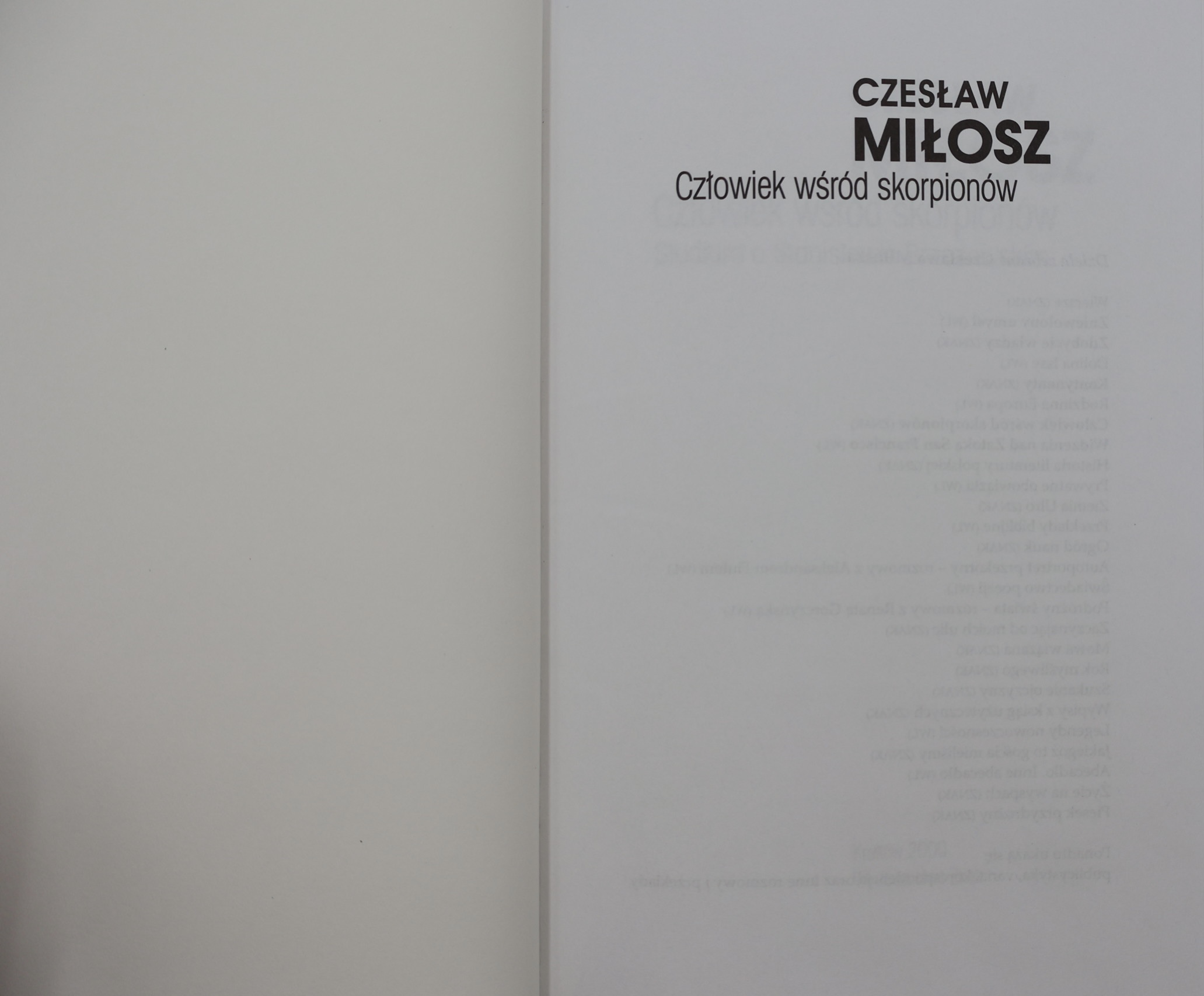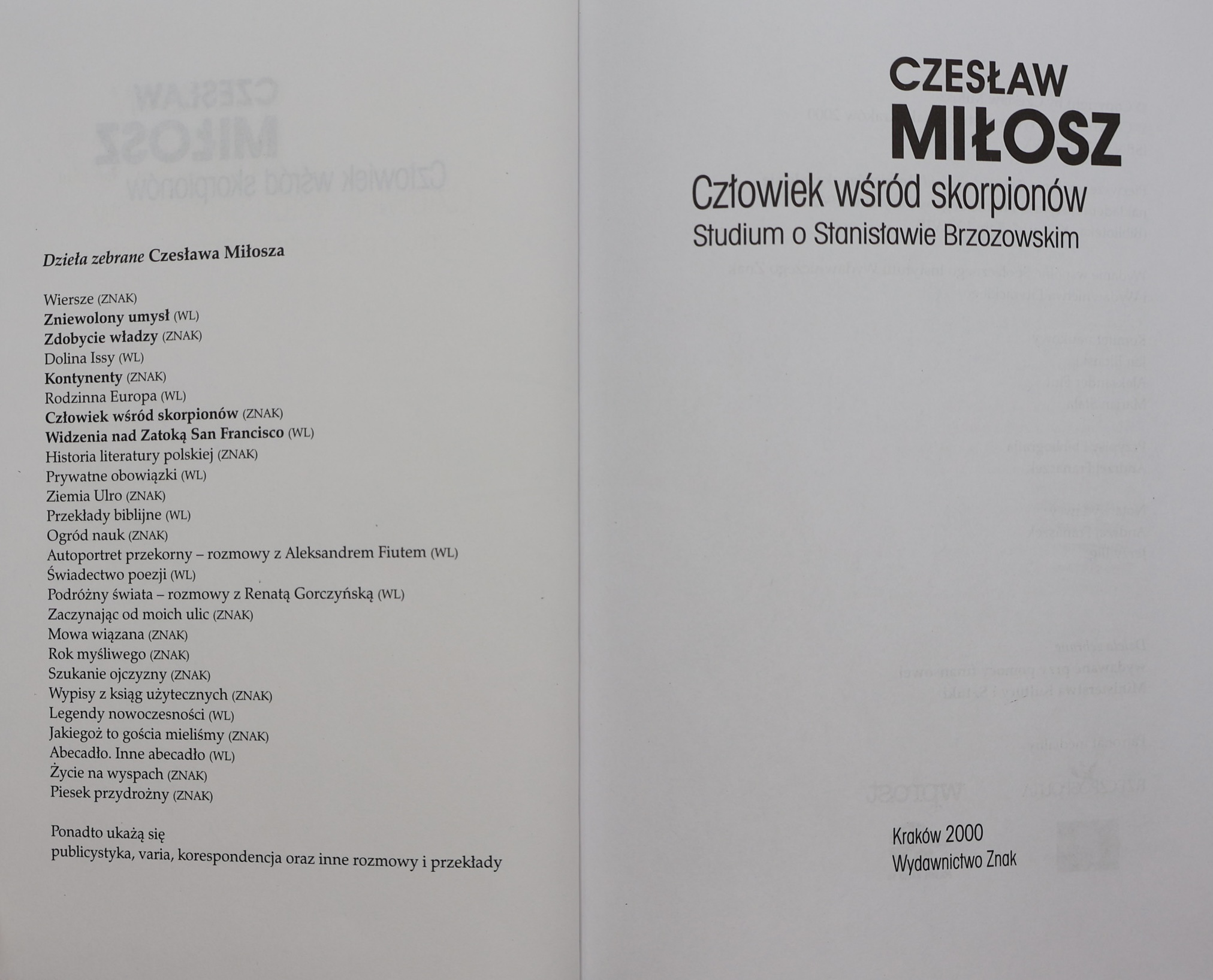 Prezentujemy wydanie „Człowieka wśród skorpionów” Czesława Miłosza (1911–2004) – poety, prozaika, eseisty, laureata literackiej Nagrody Nobla (1980), jednego z najwybitniejszych i najbardziej wpływowych intelektualistów polskich XX wieku. Publikacja ukazała się w 2000 roku w Krakowie nakładem Wydawnictwa Znak jako część prestiżowej serii „Dzieła Zebrane Czesława Miłosza”.