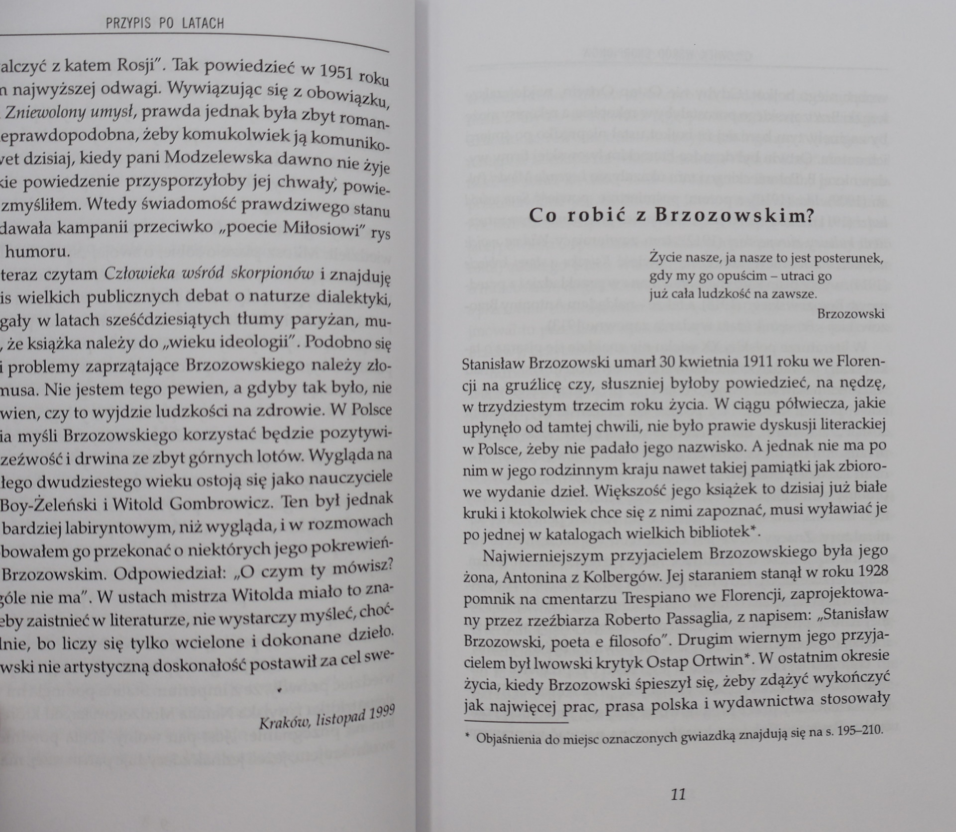 Miłosz wnikliwie omawia filozofię Brzozowskiego i recepcję jego twórczości oraz konfrontuje myśl Brzozowskiego z systemami filozoficznymi spoza jego macierzystej epoki (Jean-Paul Sartre, Boris Pasternak, Henri Lefebvre, György Lukács, André Malraux, Simone Weil), aby wyeksponować oryginalność, doniosłość i proroczy charakter jego analiz. Obszerny rozdział poświęca autor tzw. „sprawie Brzozowskiego” (bezpodstawne oskarżenie pisarza o współpracę z carską Ochraną), która przypomina „sprawę Miłosza” – jego własny dramat zerwania z rządem w Warszawie w 1951 roku i ostrej kampanii przeciwko niemu na łamach londyńskiej prasy.