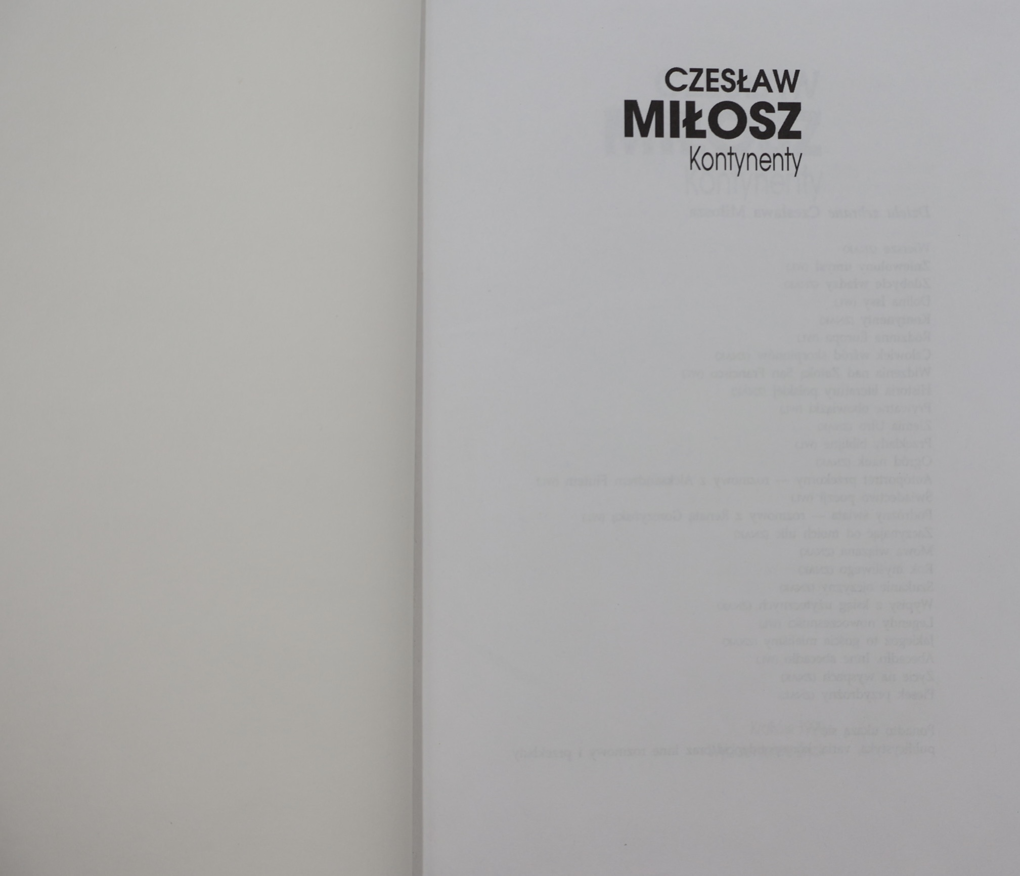 Prezentujemy pierwsze oficjalne wydanie krajowe „Kontynentów” Czesława Miłosza (1911–2004) – poety, prozaika, eseisty, laureata literackiej Nagrody Nobla (1980), jednego z najwybitniejszych i najbardziej wpływowych intelektualistów polskich XX wieku. Publikacja ukazała się w 1999 roku w Krakowie nakładem Wydawnictwa Znak jako część prestiżowej serii „Dzieła Zebrane Czesława Miłosza”.