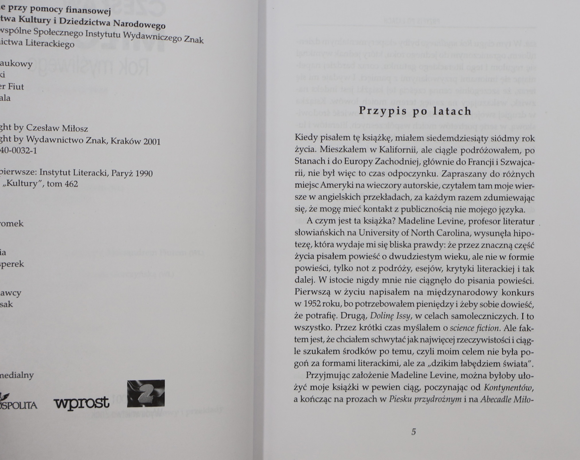 Jest to część prestiżowej serii „Dzieła Zebrane” wydawnictwa Znak. Egzemplarz jest czysty i zachowany w bardzo dobrym stanie. To obowiązkowa pozycja dla kolekcjonera dzieł Miłosza, miłośnika jego eseistyki oraz bibliofila poszukującego reprezentacyjnego wydania ostatniej powieści noblisty. Jest to również cenny materiał źródłowy dla badaczy późnej twórczości poety.