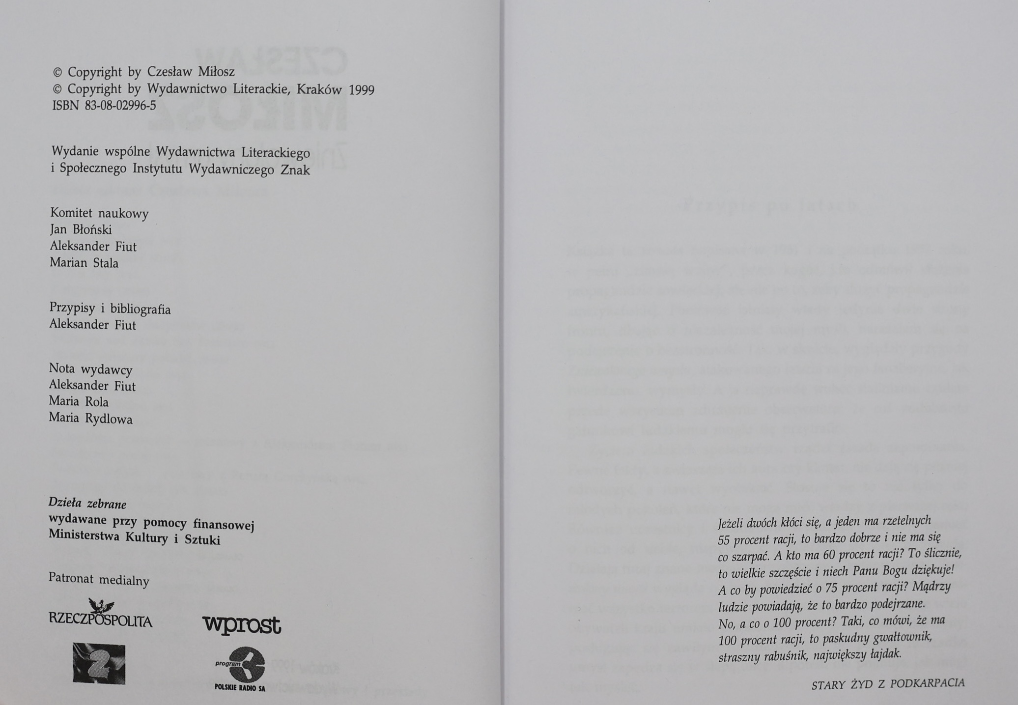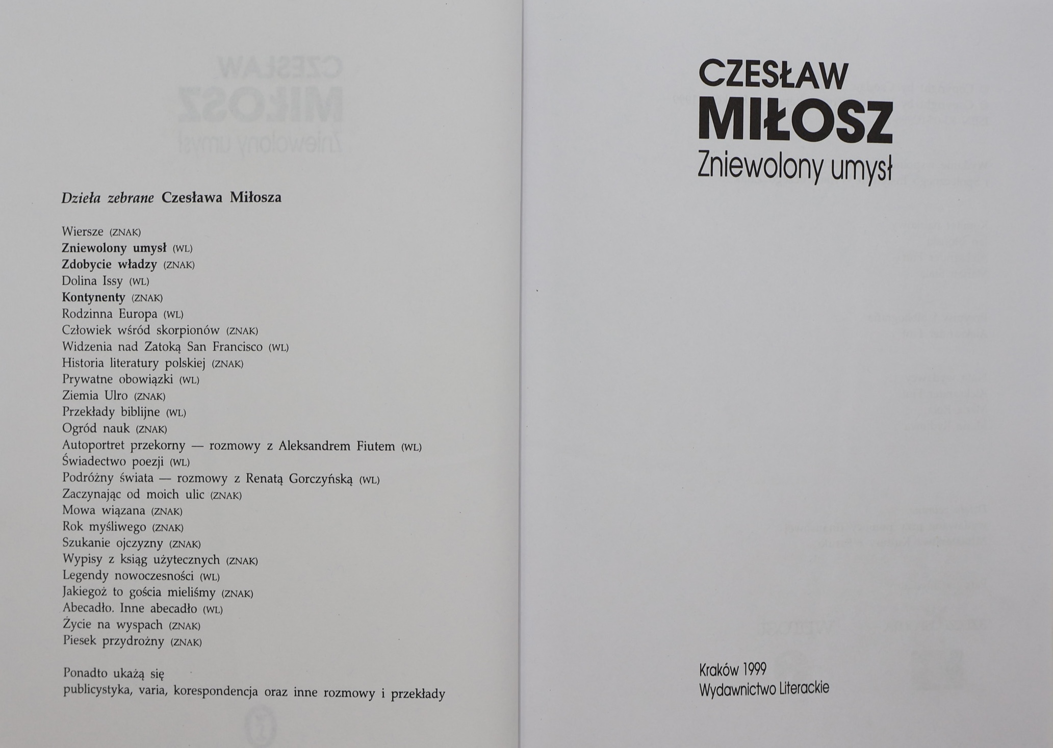 Wydawnictwo Literackie (seria Dzieła Zebrane Czesława Miłosza).