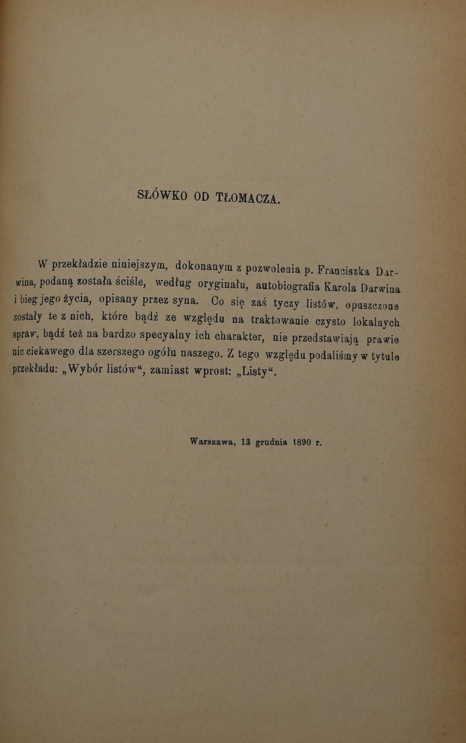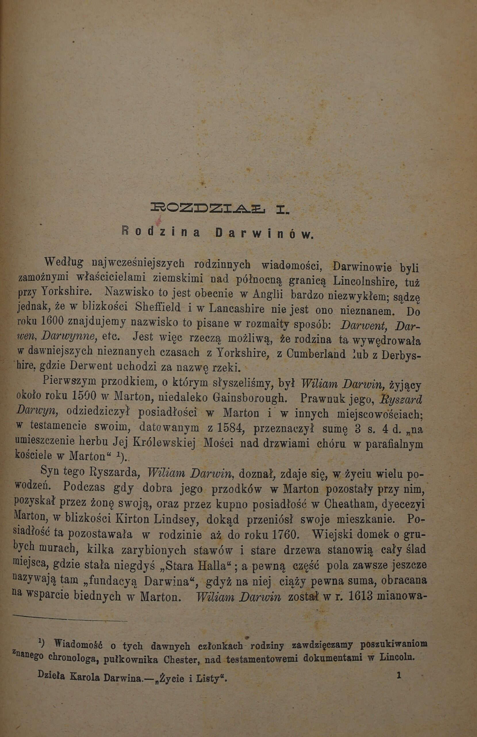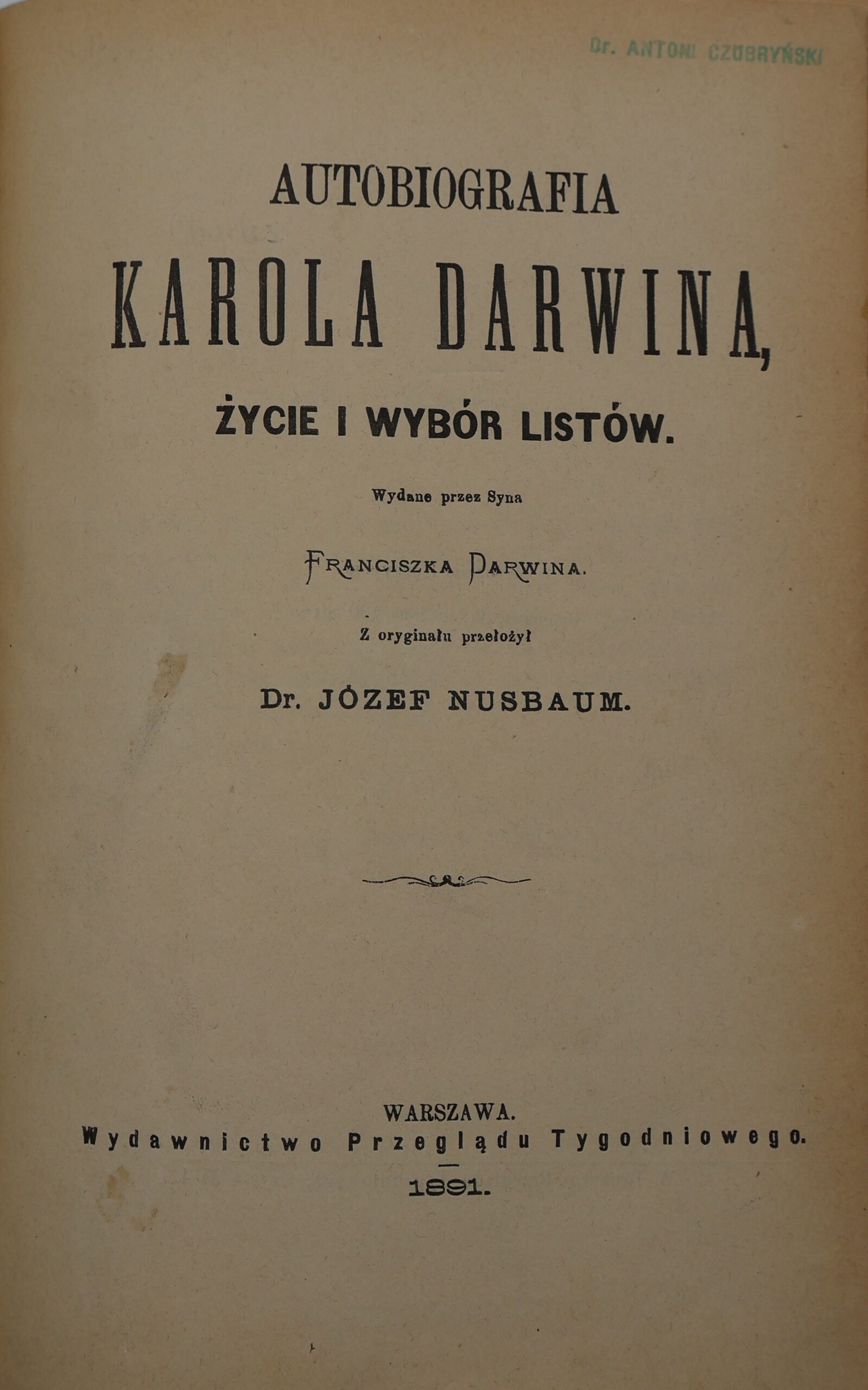 To pierwsze polskie wydanie autobiografii Karola Darwina, jednego z najwybitniejszych uczonych w dziejach ludzkości, stanowi niezwykle cenny dokument epoki i rzadkość na rynku antykwarycznym . Książka została wydana w 1891 roku nakładem warszawskiego Wydawnictwa „Przeglądu Tygodniowego” w przekładzie wybitnego biologa Józefa Nusbauma-Hilarowicza .