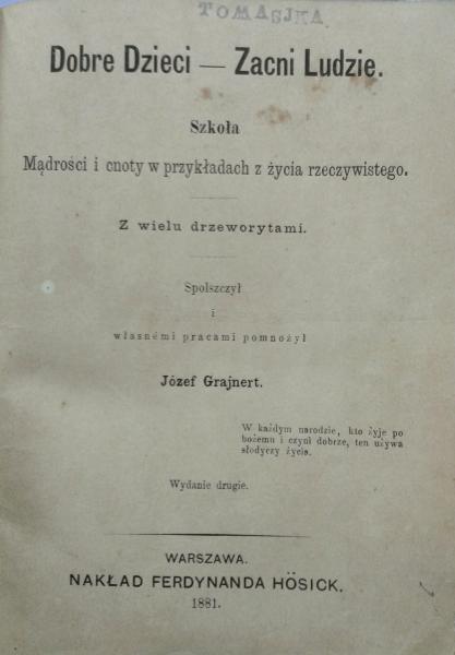 Józef Grajnert (1831-1910) był pedagogiem, publicystą i autorem książek dla dzieci i młodzieży. Jego twórczość pedagogiczna charakteryzowała się dużym zaangażowaniem w proces wychowania młodego pokolenia w duchu patriotyzmu i moralności.