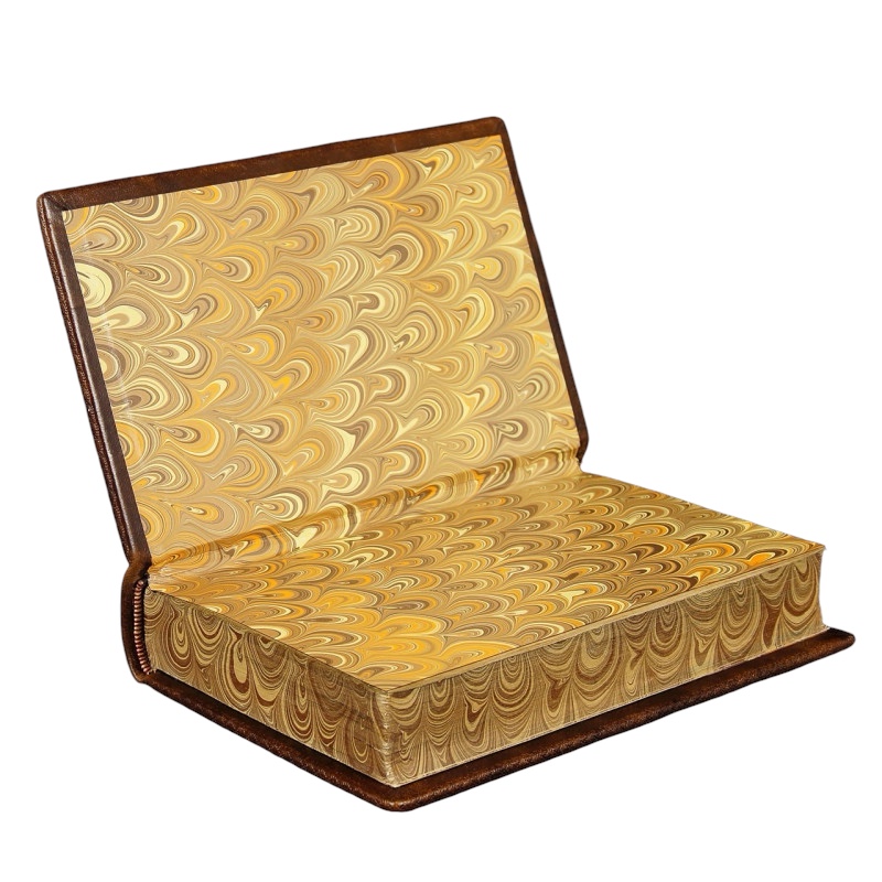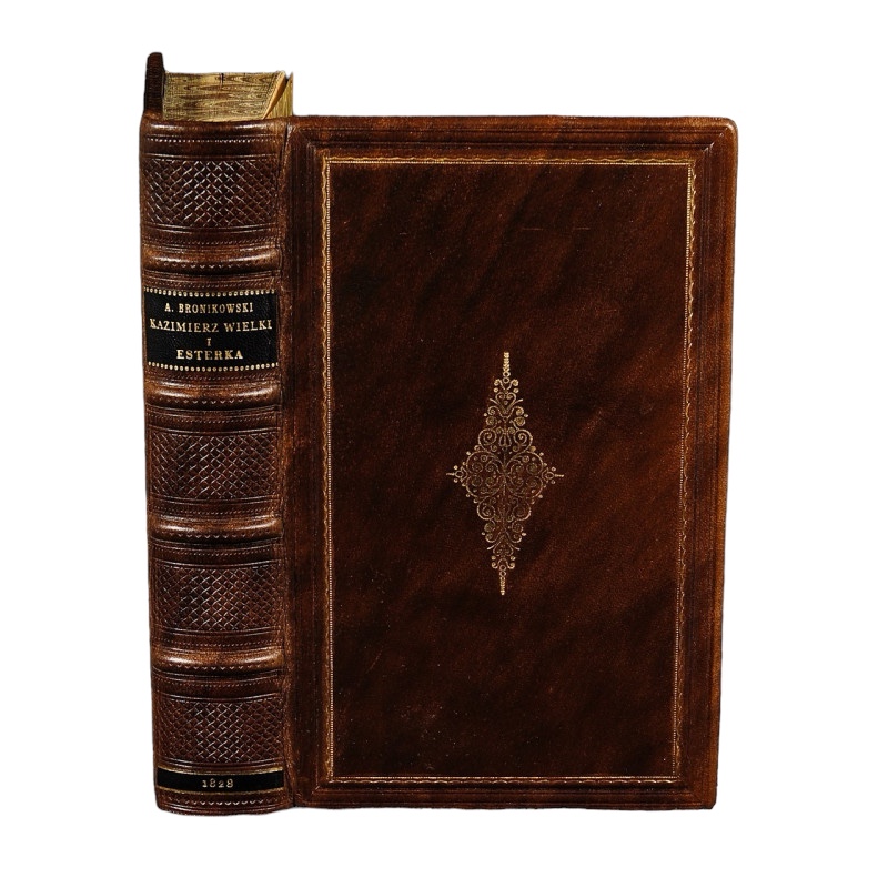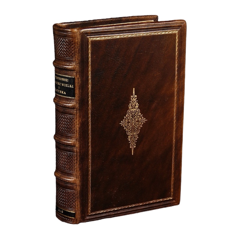 Pełna ciemnobrązowa skóra. Złocone, dekoracyjne ornamenty na okładkach. Tłoczenia na polach grzbietu oraz krawędziach. Tytulatura złotem na skórzanym szyldziku. Wyklejka oraz brzegi kart ręcznie marmoryzowane.