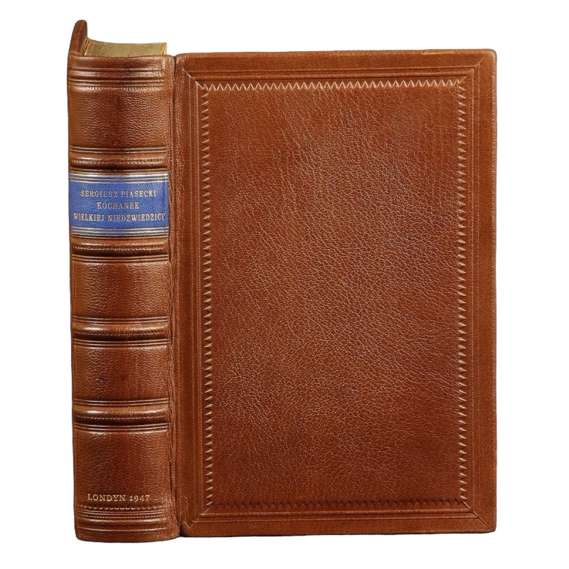 Pełna brązowa skóra. Tłoczenia na okładkach i krawędziach. Złocenia na kancikach i brzegach kart. Złocona tytulatura na skórzanym szyldziku.