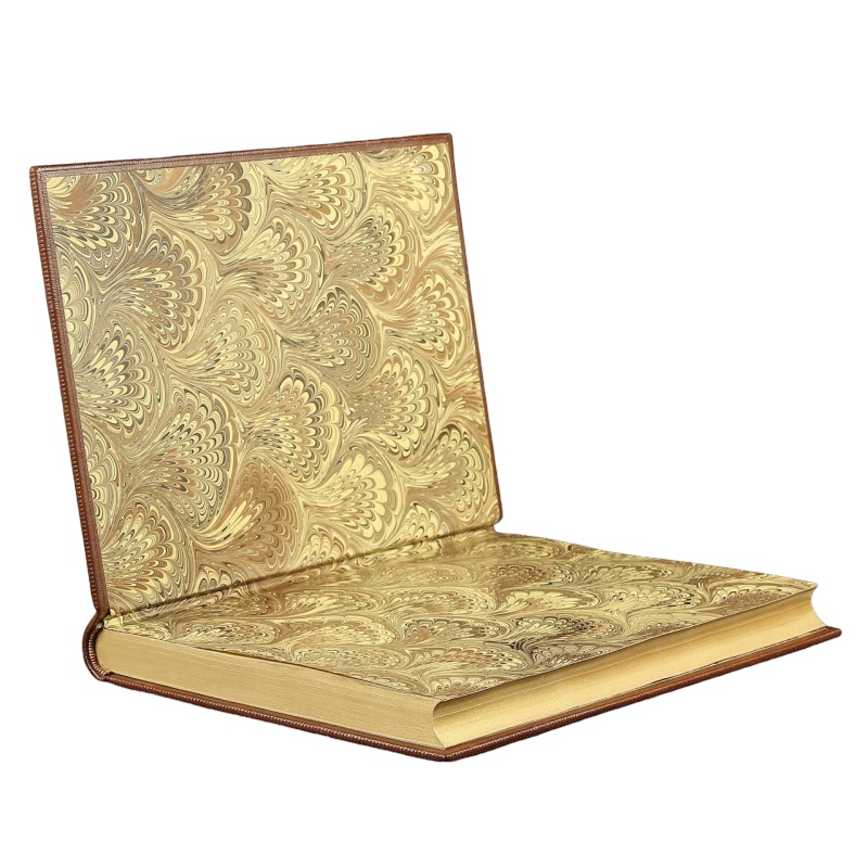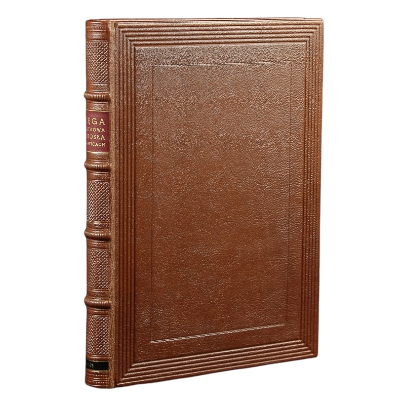 Egzemplarz czysty w dobrym stanie. Pełna brązowa skóra. Tłoczenia na polach grzbietu, okładkach oraz krawędziach. Tytulatura złotem na skórzanym szyldziku. Wyklejki ręcznie marmoryzowane. Brzegi kart złocone.