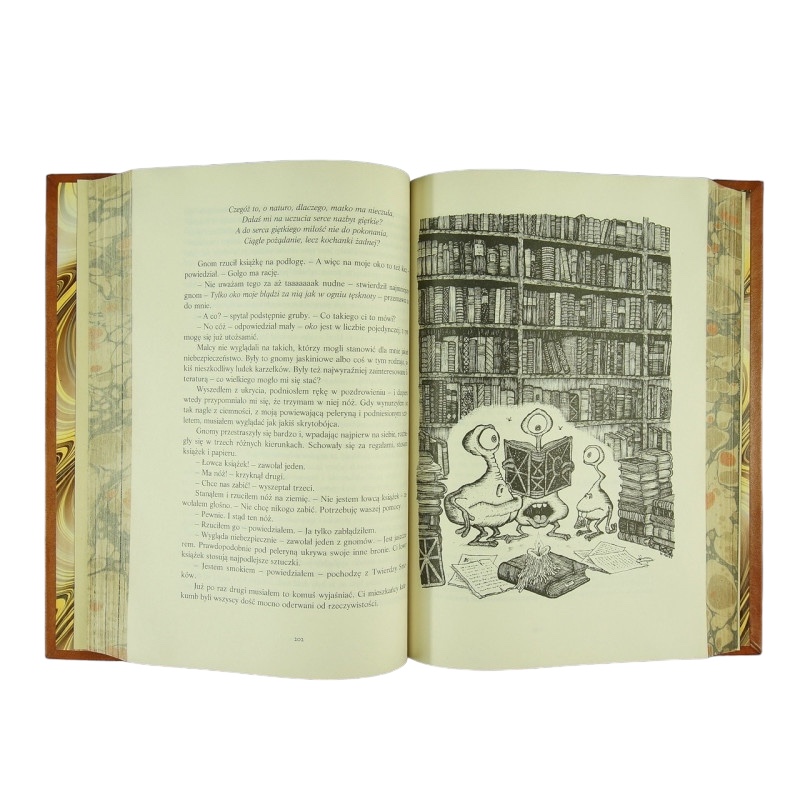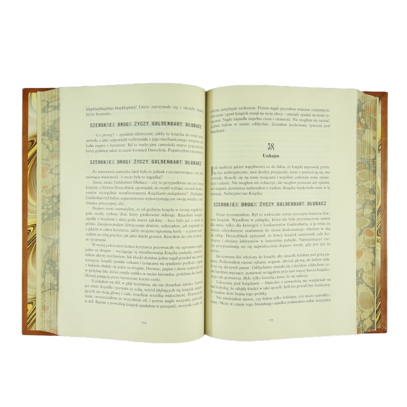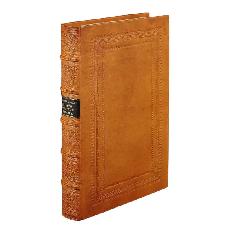 Egzemplarz czysty w bardzo dobrym stanie. Pełna brązowa skóra. Dekoracyjne tłoczenia na polach grzbietu, okładkach oraz krawędziach. Tytulatura złotem na skórzanym szyldziku. Wyklejki i brzegi kart ręcznie marmoryzowane.