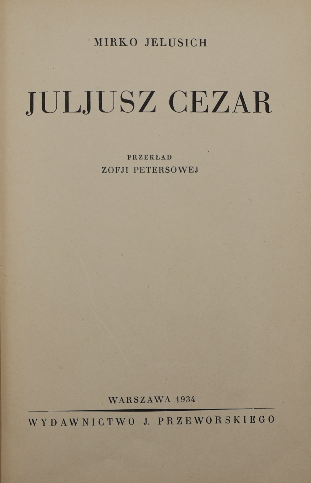 To pierwsze polskie wydanie powieści biograficznej chorwackiego pisarza Mirko Jelusicha (1886–1969), poświęconej jednemu z największych wodzów i mężów stanu w dziejach starożytnego Rzymu – Gajuszowi Juliuszowi Cezarowi. Książka ukazała się w 1934 roku nakładem warszawskiego wydawnictwa J. Przeworskiego, w tłumaczeniu Zofii Petersowej .