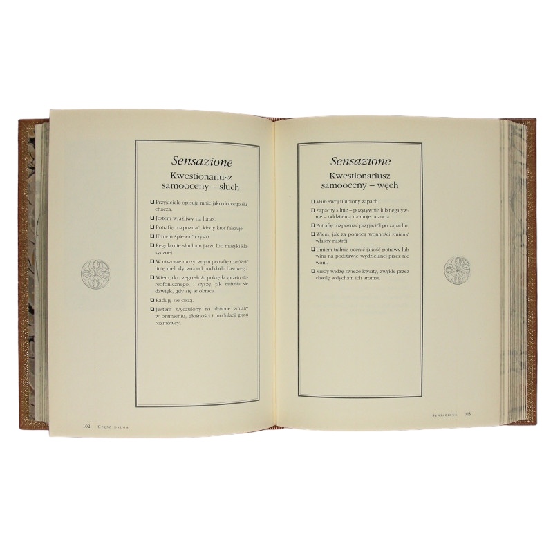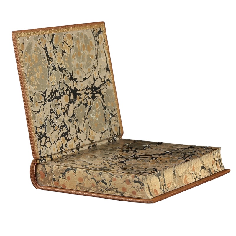 Egzemplarz czysty w bardzo dobrym stanie. Pełna brązowa skóra. Tłoczenia na krawędziach, złocenia na kancikach. Złocona ramka na okładkach. Złocona tytulatura na skórzanym szyldziku. Wyklejka i brzegi kart ręcznie marmoryzowane.