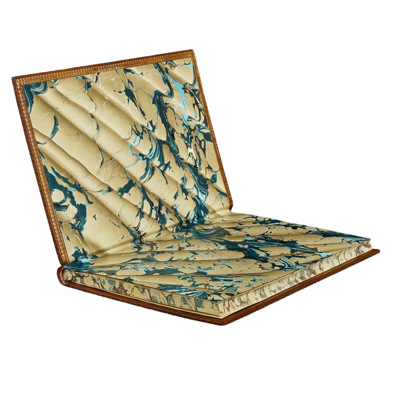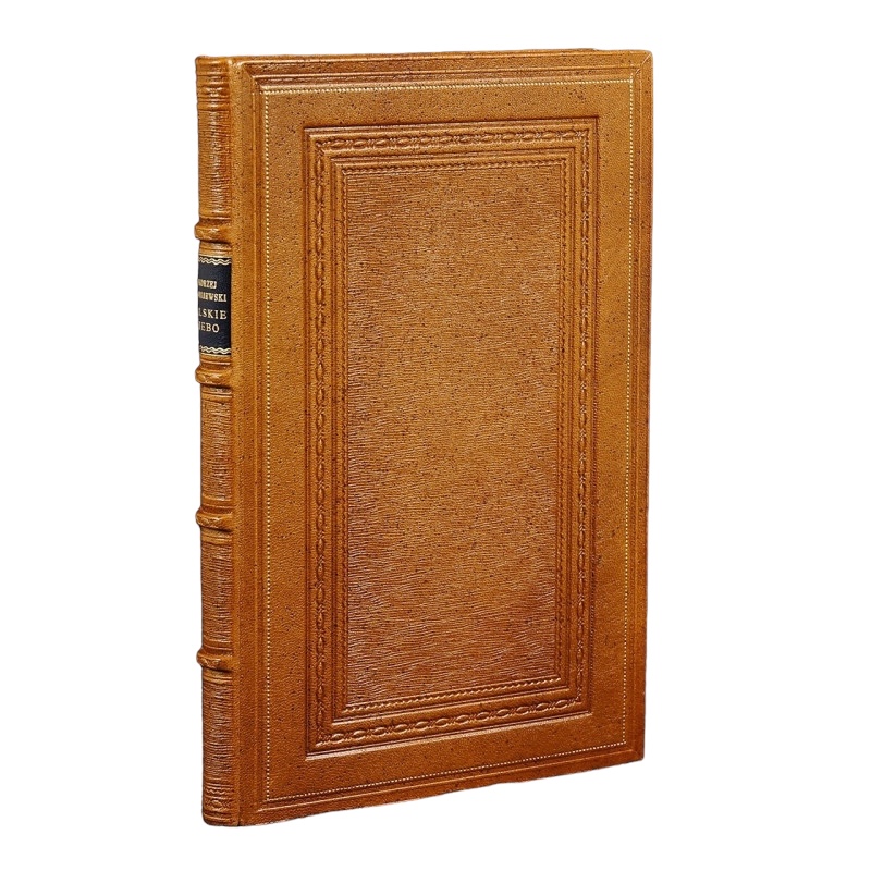 Pełna jasnobrązowa skóra. Ślepe tłoczenie na polach grzbietu oraz okładkach. Złocenia na krawędziach i kancikach. Złocona tytulatura na skórzanym szyldziku. Wyklejka oraz brzegi kart ręcznie marmoryzowane.