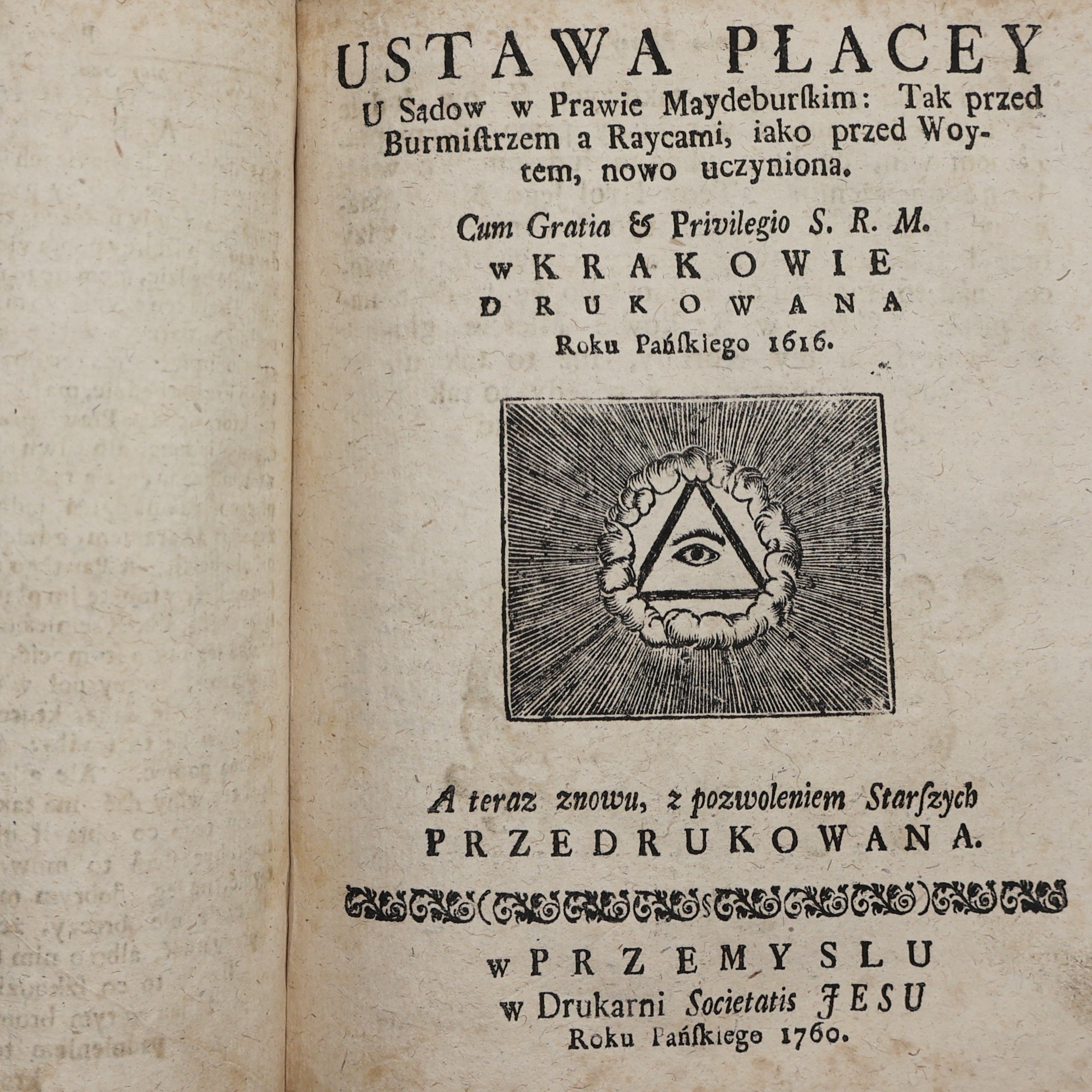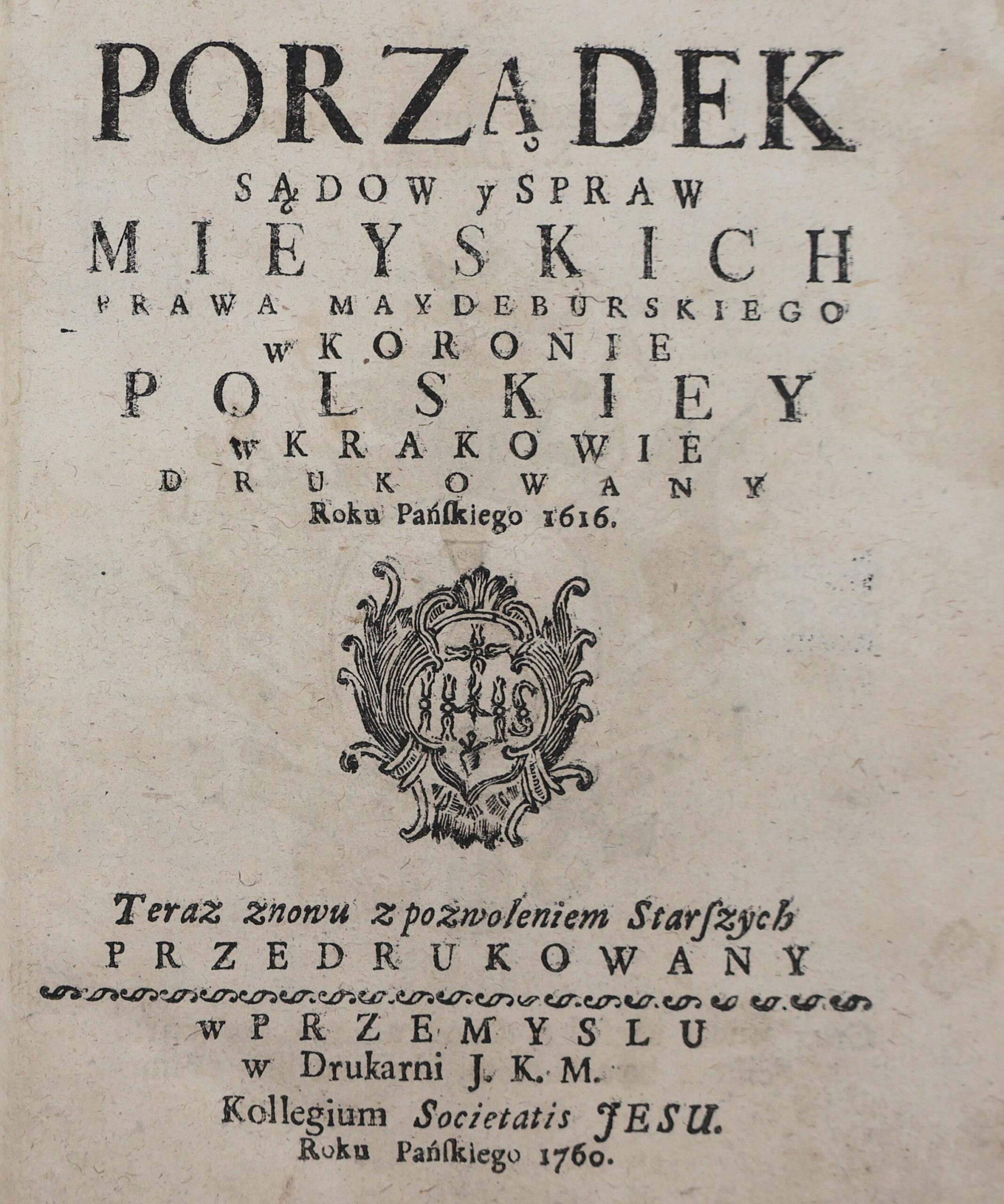 acc.: Artykuły prawa Maydeburskiego […] przełożone y znowu drukowane Roku Pańskiego 1629. A teraz znowu, z Pozwoleniem Starszych przedrukowane. Przemyśl 1760. W Drukarni Societatis Jesu. [2], 64, [2]s.; acc.: Postępek Wybrany iest z Praw Cesarskich […]. W Krakowie drukowany Roku Pańskiego 1616. A teraz znowu, z pozwoleniem Starszych przedrukowany. Przemyśl 1760. W Drukarni Societatis Jesu. [2], 54s.; acc.: Ustawa płacey U Sądów w Prawie Maydeburskim. […] W Krakowie drukowana Roku Pańskiego 1616. A teraz znowu, z pozwoleniem Starszych przedrukowana. Przemyśl 1760. W Drukarni Societatis Jesu. [12] s.; acc.: Rejestr do porządku y do Artykułów Prawa Maydeburskiego, y Cesarskiego. W Krakowie drukowany Roku Pańskiego 1616. A teraz znowu, z pozwoleniem Starszych przedrukowany. Przemyśl 1760. W Drukarni Societatis Jesu. [58] s.; acc.: Tytuły prawa Maydeburskiego Do porządku y do Artykułów, pierwey po Polsku wydanych. […] W Krakowie drukowany Roku Pańskiego 1616. A teraz znowu, z pozwoleniem Starszych przedrukowany. Przemyśl 1760. W Drukarni Societatis Jesu. [1], 238, [16] s.; acc.: Enchiridion aliquot locorum communium luris Magdeburgensis. Per Joannem Kirsteyn Cerasinum […] explicatorum. W Krakowie drukowany Roku Pańskiego 1616. A teraz znowu, z pozwoleniem Starszych przedrukowany. Przemyśl 1760. W Drukarni Societatis Jesu. [54]s.; acc.: Abrogatio et Moderatio abusuum et sumptuum. […] W Krakowie drukowany Roku Pańskiego 1616. A teraz znowu, z pozwoleniem Starszych przedrukowany. Przemyśl 1760. W Drukarni Societatis Jesu. [10] s.;