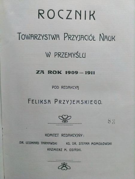 „Rocznik Towarzystwa Przyjaciół Nauk w Przemyślu za rok 1909-1911, T. I” pod redakcją Feliksa Przyjemskiego to niezwykle cenna publikacja wydana w 1912 roku w Przemyślu. Dzieło to gromadzi prace wielu znakomitych badaczy i twórców, którzy dzielą się swoimi odkryciami w dziedzinach historii, nauk przyrodniczych, literatury oraz sztuki. Rocznik dokumentuje działalność towarzystwa oraz rozwój myśli naukowej w regionie, a także stanowi znakomite źródło dla historyków badających kulturę Galicji na początku XX wieku.