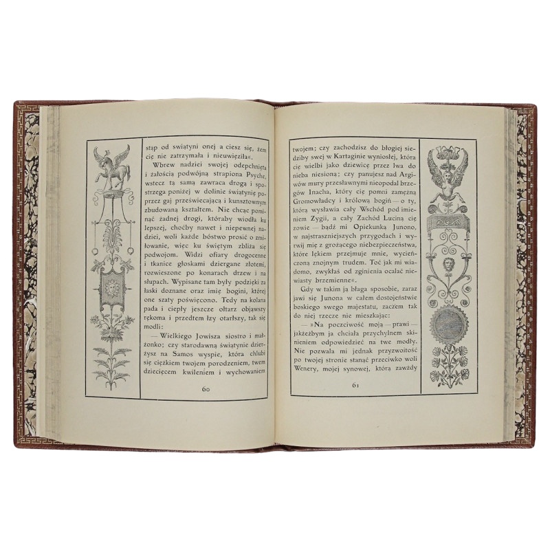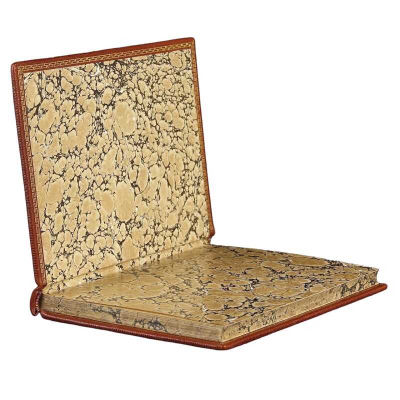 Egzemplarz czysty w dobrym stanie. Pełna brązowa skóra. Tłoczenia na zwięzach oraz okładkach i krawędziach. Złocenia na kancikach. Tytulatura złotem na skórzanym szyldziku. Wyklejki i brzegi kart ręcznie marmoryzowane.