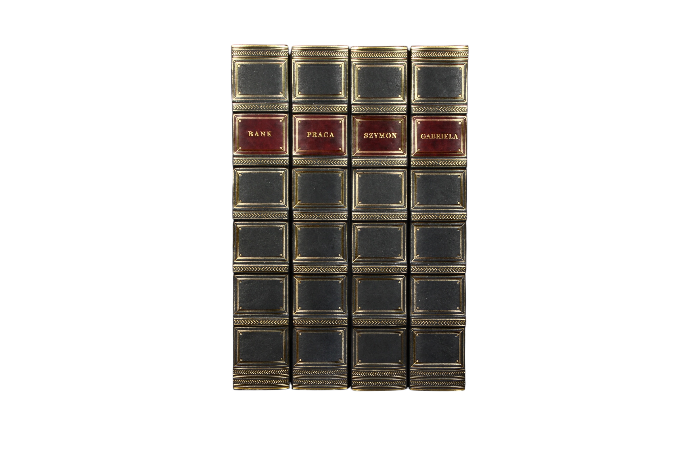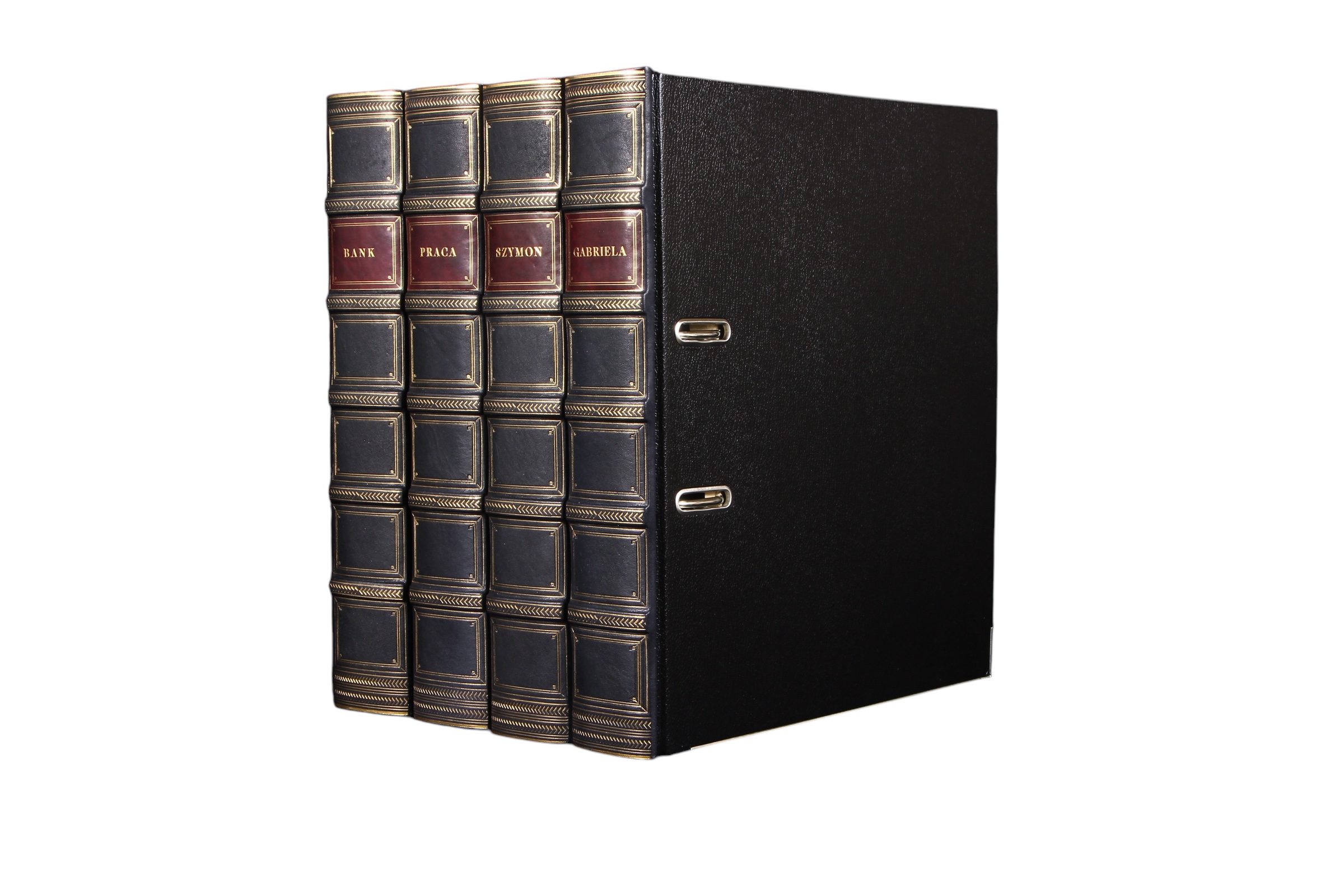 Cały proces odbywa się ręcznie według tradycyjnych metod dawnych introligatorskich mistrzów. Do wyrobu grzbietów segregatorów używamy jedynie najwyższej jakości skór, które według życzenia mogą zostać antykowane, aby przypominały nadgryzione zębem czasu egzemplarze dawnych ksiąg. Bazą naszych projektów są segregatory renomowanej firmy Leitz z mechanizmem objętym 5 letnią gwarancją producenta. Możliwe jest również wytłoczenie na szyldzie dowolnego tytułu bądź też logotypu na zamówienie. Jeśli interesują Państwa inne wersje kolorystyczne, to prosimy o kontakt z nami w celu ustalenia szczegółów.