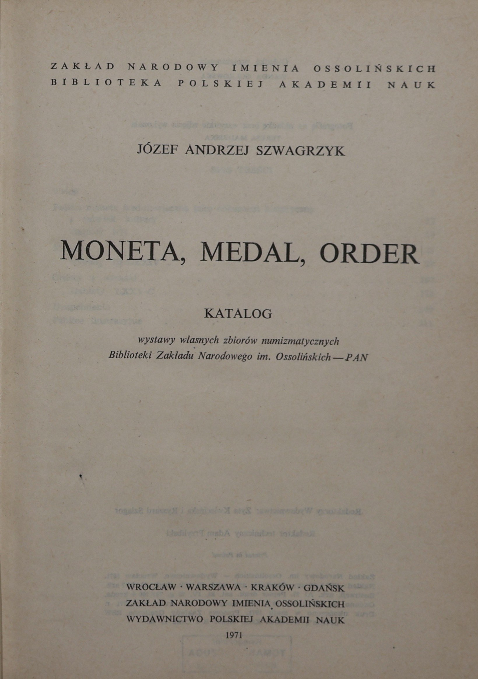 ![Szwagrzyk Józef Andrzej, Moneta, medal, order: katalog wystawy własnych zbiorów numizmatycznych Biblioteki Zakładu Narodowego im. Ossolińskich PAN [1971]](https://antykwariat-polski.pl/wp-content/uploads/2025/03/IMG_8912-scaled.jpeg)