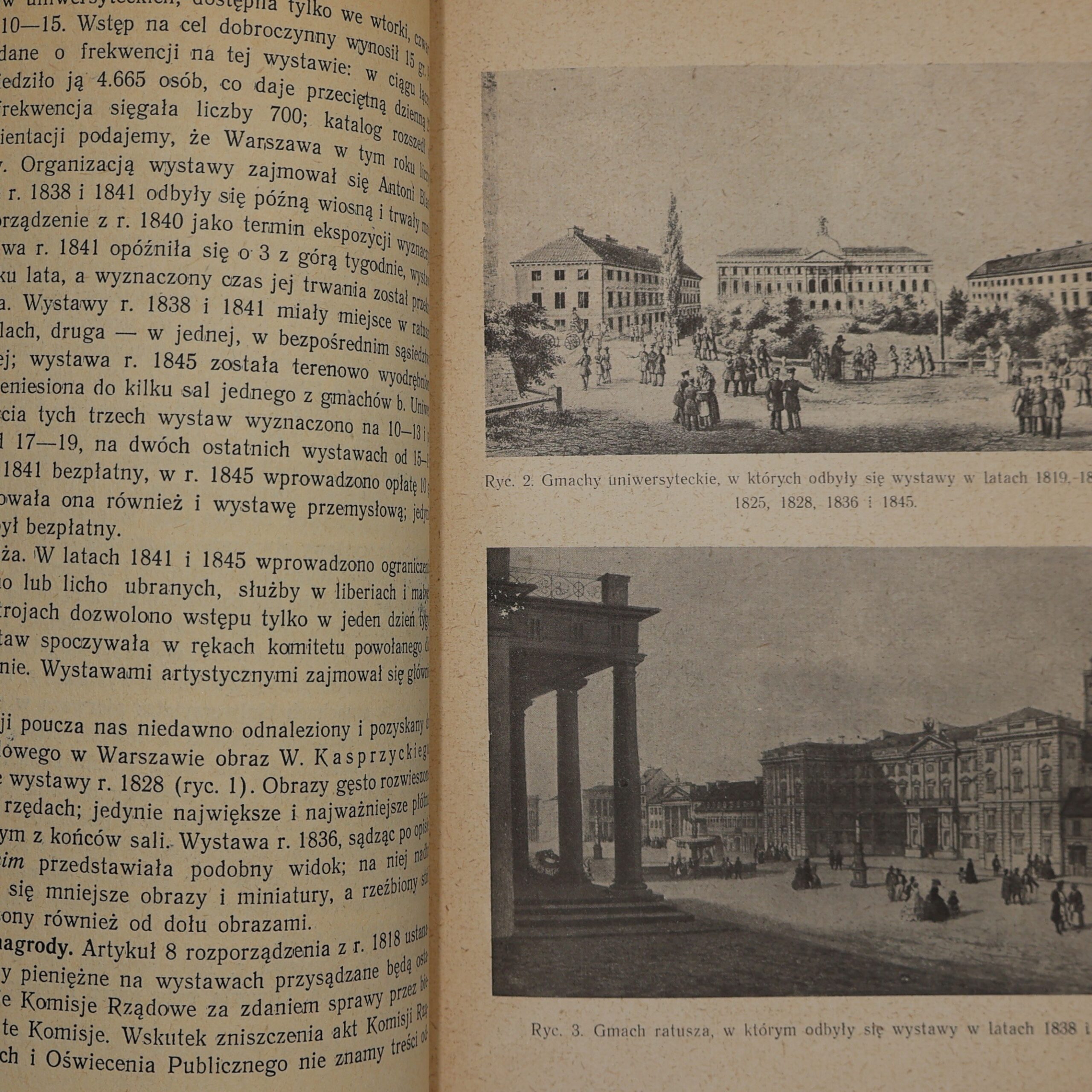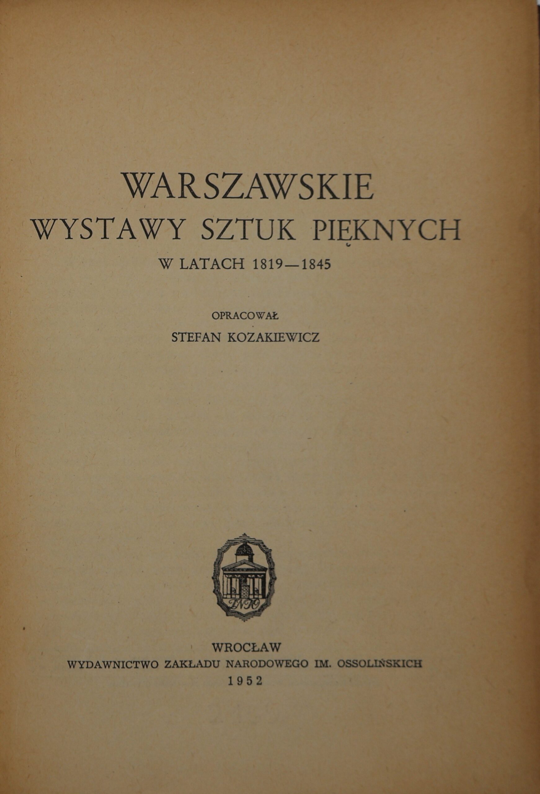 Fundamentalne i obszerne opracowanie warszawskiego życia artystycznego pierwszej połowy XIX wieku. Zawiera prace, recenzje, wzmianki oraz zestawienie nagród. Na końcu wykaz dzieł wystawionych przez poszczególnych artystów na dziewięciu wystawach w latach 1819-1845 oraz indeks osobowy artystów działających w tym okresie. Egzemplarz czysty w bardzo dobrym stanie.