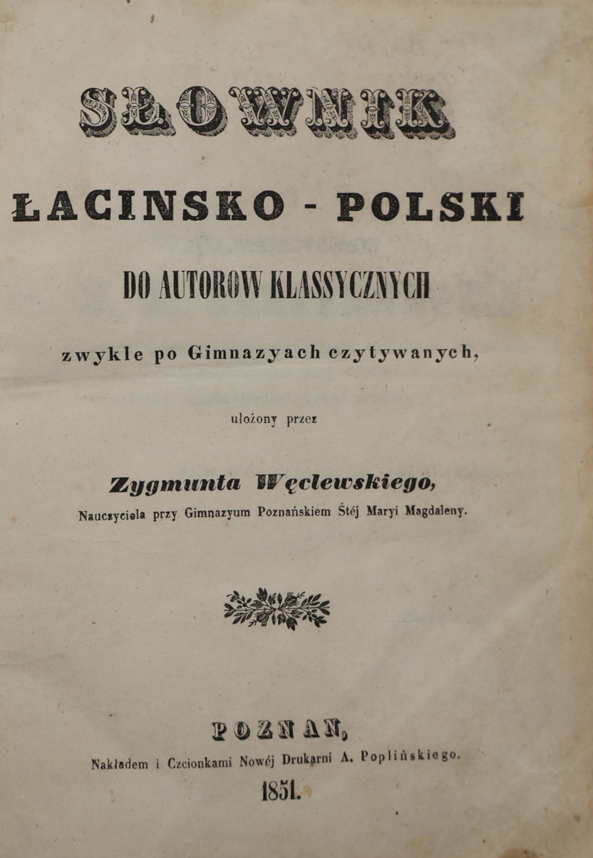 ZYGMUNT WĘCLEWSKI: SŁOWNIK ŁACIŃSKO-POLSKI DO AUTORÓW KLASSYCZNYCH ZWYKLE PO GIMNAZYACH CZYTANYCH [1851]